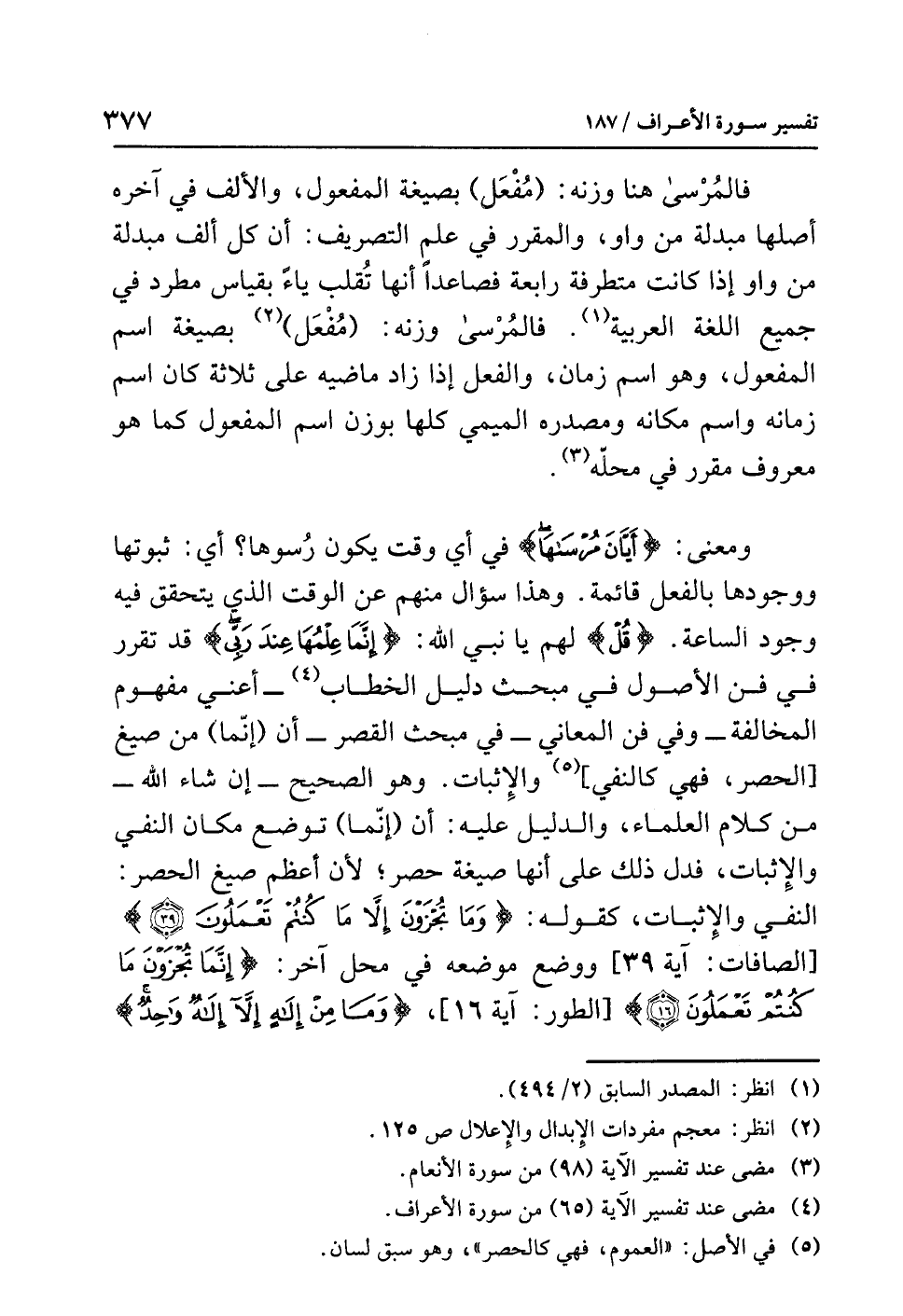 ومعنى: {أَيَّانَ مُرْسَاهَا} في أي وقت يكون رُسُوّها؟ أي: ثبوتها ووجودها بالفعل قائمة. وهذا سؤال منهم عن الوقت الذي يَتَحَقَّق فيه وجود الساعة. {قُلْ} لهم يا نبي الله: {إِنَّمَا عِلْمُهَا عِندَ رَبِّي} قد تَقَرَّرَ في فن الأصول في مباحث دليل الخطاب (¬4) -أعني مفهوم المخالفة- وفي فن المعاني -في مبحث القصر- أن (إنّما) من صيغ [الحصر، فهي كالنفي] (¬5) والإثبات. وهو الصحيح -إن شاء الله- من كلام العلماء، والدليل عليه: أن (إنّما) توضع مكان النفي والإثبات، فدل ذلك على أنها صيغة حصر؛ لأن أعظم صيغ الحصر: النفي والإثبات، كقوله: {وَمَا تُجْزَوْنَ إِلاَّ مَا كُنتُمْ تَعْمَلُونَ (39)} [الصافات: آية 39] ووضع موضعه في محل آخر: {إِنَّمَا تُجْزَوْنَ مَا كُنتُمْ تَعْمَلُونَ} [الطور: آية 16] {وَمَا مِنْ إِلَهٍ إِلاَّ إِلَهٌ وَاحِدٌ}