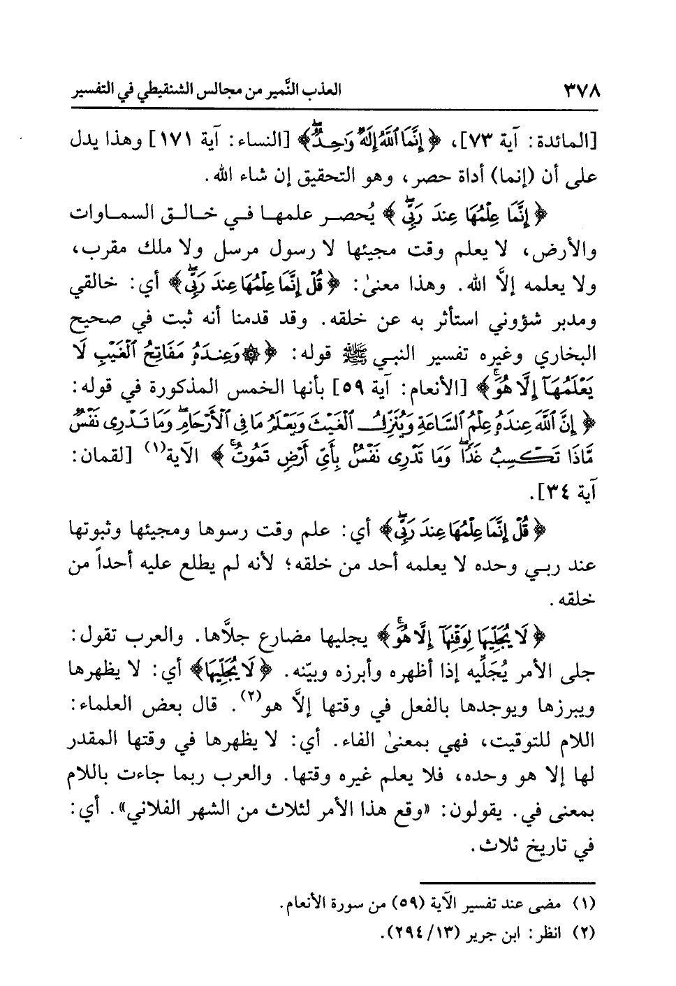 {إِنَّمَا عِلْمُهَا عِندَ رَبِّي} يُحصر علمها في خالق السَّمَاوات والأرض، لا يعلم وقت مجيئها لا رسول مرسل ولا ملك مقرب، ولا يعلمه إلاَّ الله. وهذا معنى: {قُلْ إِنَّمَا عِلْمُهَا عِندَ رَبِّي} أي: خالقي ومدبر شؤوني استأثر به عن خلقه. وقد قدمنا أنه ثبت في صحيح البخاري وغيره تفسير النبي صلى الله عليه وسلم قوله: {وَعِندَهُ مَفَاتِحُ الْغَيْبِ لاَ يَعْلَمُهَا إِلاَّ هُوَ} [الأنعام: آية 59] بأنها الخمس المذكورة في قوله: {إِنَّ اللَّهَ عِندَهُ عِلْمُ السَّاعَةِ وَيُنَزِّلُ الْغَيْثَ وَيَعْلَمُ مَا فِي الأَرْحَامِ وَمَا تَدْرِي نَفْسٌ مَّاذَا تَكْسِبُ غَدًا وَمَا تَدْرِي نَفْسٌ بِأَيِّ أَرْضٍ تَمُوتُ} الآية (¬1) [لقمان: آية 34].