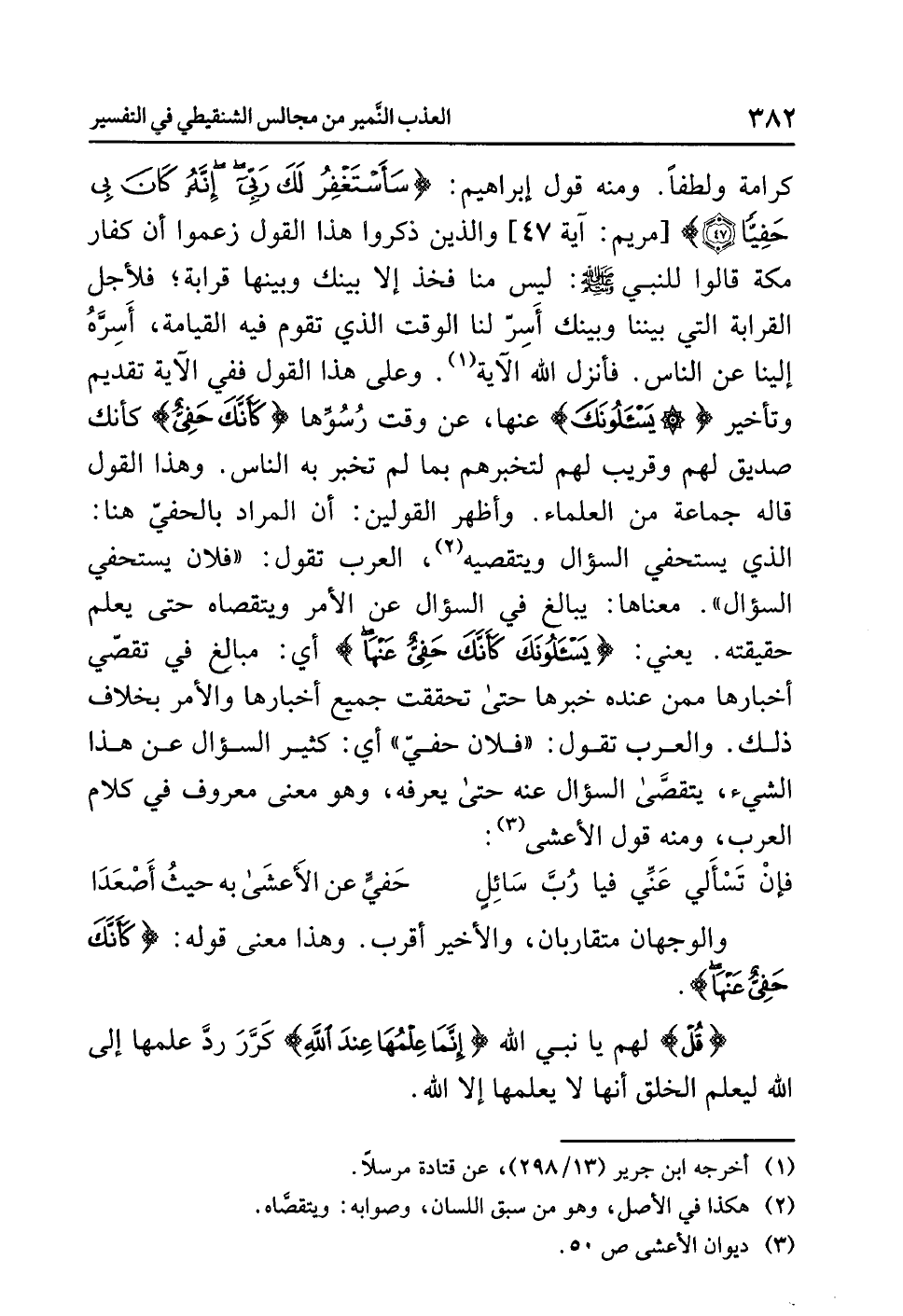 كرامة ولطفًا. ومنه قول إبراهيم: {سَأَسْتَغْفِرُ لَكَ رَبِّي إِنَّهُ كَانَ بِي حَفِيًّا} [مريم: آية 47] والذين ذكروا هذا القول زعموا أن كفار مكة قالوا للنبي صلى الله عليه وسلم: ليس منا فخذ إلا بينك وبينها قرابة؛ فلأجل القرابة التي بيننا وبينك أَسِرّ لنا الوقت الذي تقوم فيه القيامة، أَسِرَّهُ إلينا عن الناس. فأنزل الله الآية (¬1). وعلى هذا القول ففي الآية تقديم وتأخير {يَسْأَلُونَكَ} عنها، عن وقت رُسُوِّها {كَأَنَّكَ حَفِيٌّ} وكأنك صديق لهم وقريب لهم لتخبرهم بما لم تخبر به الناس. هذا القول قاله جماعة من العلماء. وأظهر القولين: أن المراد بالحفيّ هنا: الذي يستحفي السؤال ويتقصيه (¬2)، العرب تقول: فلان يستحفي السؤال، معناها: يبالغ في السؤال عن الأمر ويتقصاه حتى يعلم حقيقته. يعني: {يَسْأَلُونَكَ كَأَنَّكَ حَفِيٌّ عَنْهَا} أي: مبالِغ في تقصّي أخبارها ممن عنده خبرها حتى تحققت جميع أخبارها والأمر بخلاف ذلك. والعرب تقول: فلان حفيّ: أي: كثير السؤال عن هذا الشيء، يتقصَّى السؤال عنه حتى يعرفه، وهو معنى معروف في كلام العرب، ومنه قول الأعشى (¬3):