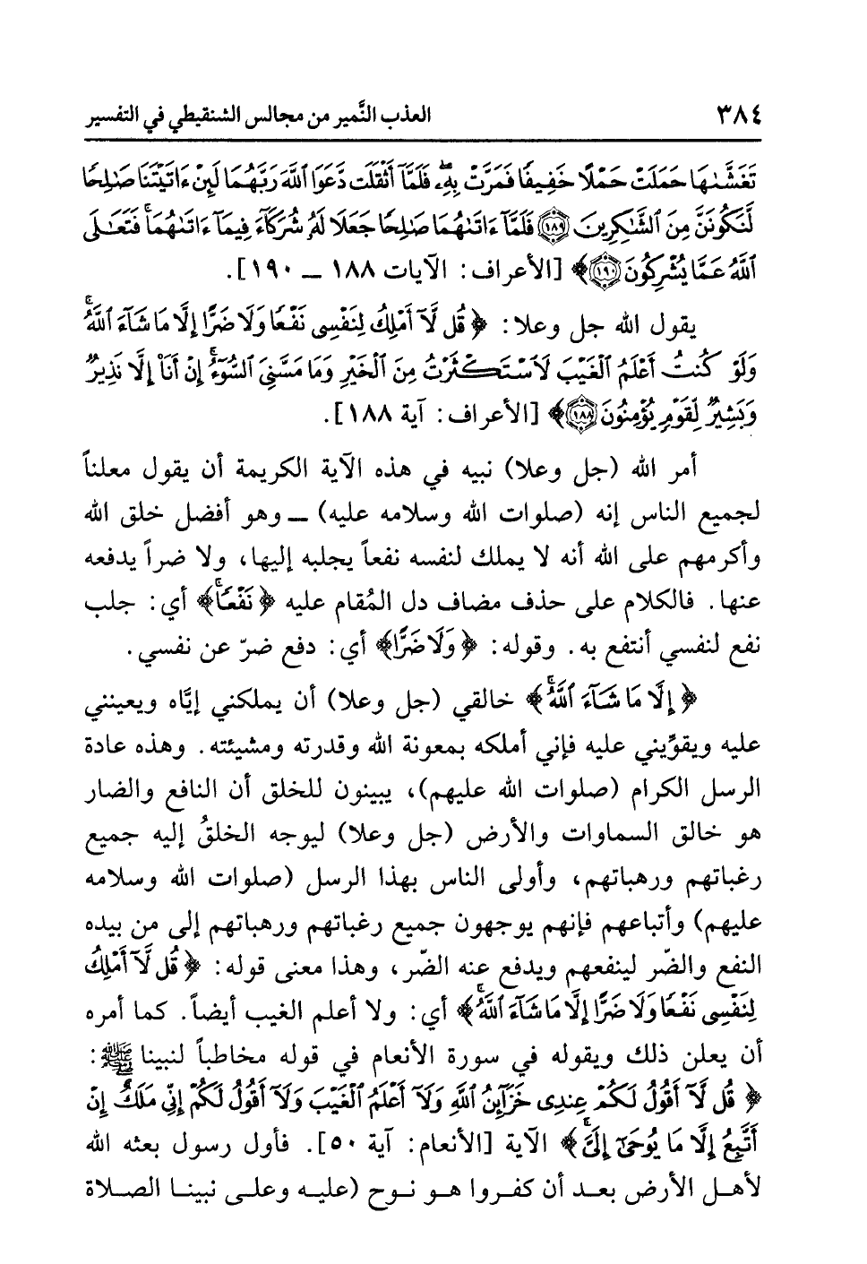 {إِلاَّ مَا شَاء اللَّهُ} خالقي (جل وعلا) أن يملكني إيَّاه ويعينني عليه ويقوِّيني عليه فإني أملكه بمعونة الله وقدرته ومشيئته، وهذه عادة الرُّسُلِ الكِرَامِ (صلوات الله عليهم)، يُبَيِّنُونَ لِلْخَلْقِ أَنَّ النَّافِعَ والضَّارَّ هو خالق السماوات والأرض (جل وعلا) ليُوَجه الخلقُ إليه جميع رغباتهم ورهَباتهم، وأولى الناس بهذا الرسل (صلوات الله وسلامه عليهم) وأتباعهم فإنهم يوجهون جميع رغباتهم ورهباتهم إلى مَنْ بِيَدِهِ النَّفْع والضّر لينفعهم ويدفع عنهم الضّر، وهذا معنى قوله: {قُل لاَّ أَمْلِكُ لِنَفْسِي نَفْعًا وَلاَ ضَرًّا إِلاَّ مَا شَاء اللَّهُ} أي: ولا أعلم الغيب أيضًا. كما أمره أن يعلن ذلك ويقوله في سورة الأنعام في قوله مخاطبًا لنبينا صلى الله عليه وسلم: {قُل لاَّ أَقُولُ لَكُمْ عِندِي خَزَآئِنُ اللَّهِ وَلا أَعْلَمُ الْغَيْبَ وَلا أَقُولُ لَكُمْ إِنِّي مَلَكٌ إِنْ أَتَّبِعُ إِلاَّ مَا يُوحَى إِلَيَّ ... } الآية [الأنعام: آية 50]. فأول رسول بعثه الله لأهل الأرض بعد أن كفروا هو نوح (عليه وعلى نبينا الصلاة