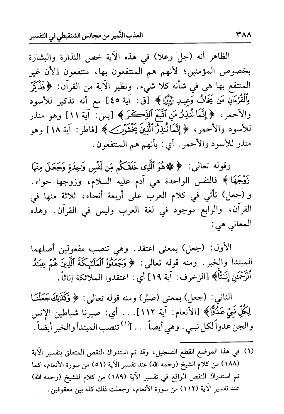 (¬1) في هذا الموضع انقطع التسجيل، وقد تَمَّ اسْتِدْرَاك النقص المتعلق بتفسير الآية (188) من كلام الشيخ (رحمه الله) عند تفسير الآية (51) من سورة الأنعام. كما تم استدراك النقص الواقع في تفسير الآية (189) من كلام للشيخ (رحمه الله) عند تفسير الآية (112) من سورة الأنعام. وجعلت ذلك كله بين معقوفين.
