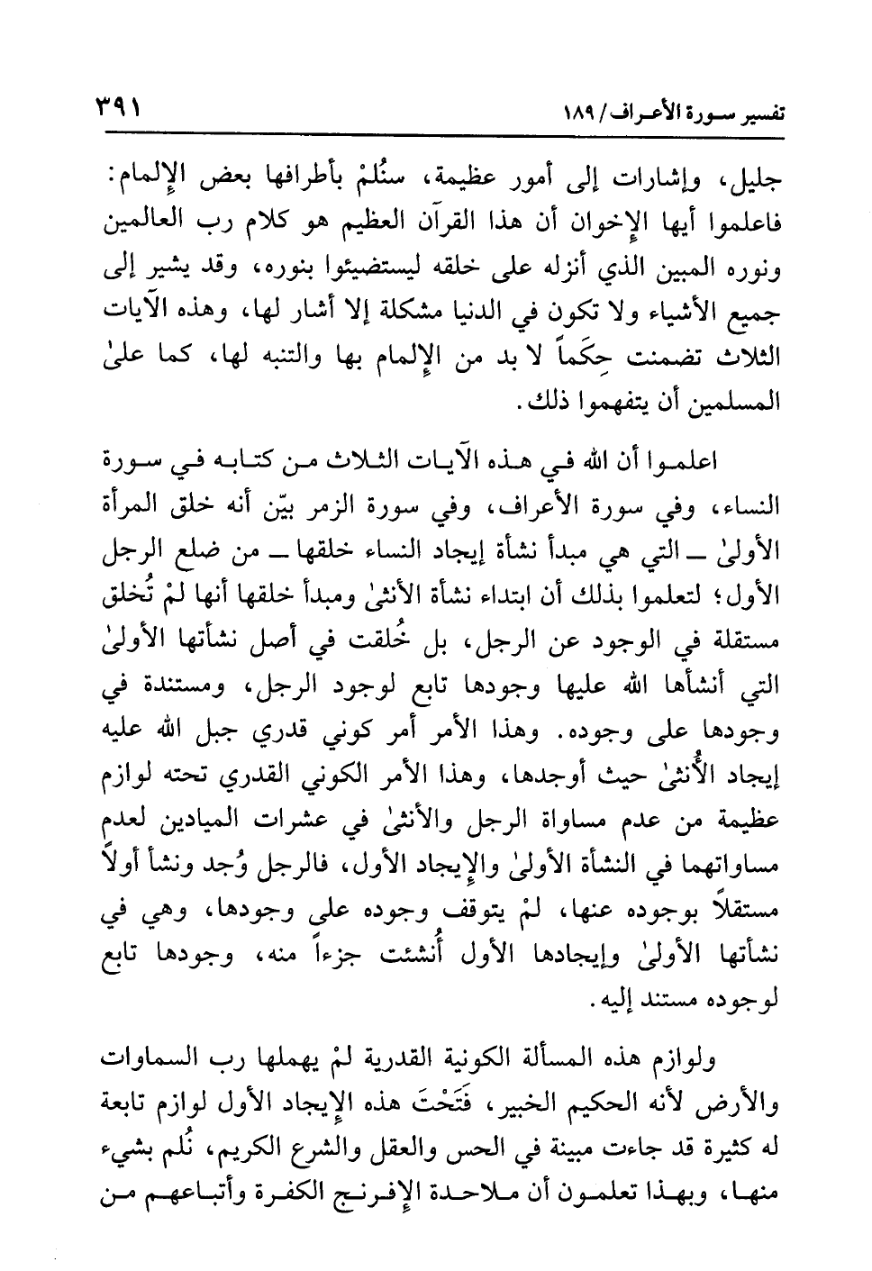اعلموا أن الله في هذه الآيات الثلاث من كتابه في سورة النساء، وفي سورة الأعراف، وفي سورة الزمر بيَّن أنَّهُ خَلق المرأة الأولى -التي هي مبدأ نشأة إيجاد النساء خلقها- مِنْ ضلع الرجل الأول؛ لتعلموا بذلك أن ابتداء نشأة الأنثى ومبدأ خلقها أنها لم تُخلق مستقلة في الوجود عن الرجل، بل خُلقت في أصل نشأتها الأولى التي أنشأها الله عليها وجودها تابع لوجود الرجل، ومستندة في وجودها على وجوده. وهذا الأمر أمر كوني قدري جبل الله عليه إيجاد الأنثى حيث أوجدها، وهذا الأمر الكوني القدري تحته لوازم عظيمة من عدم مساواة الرجل والأنثى في عشرات الميادين لعدم مساواتهما في النشأة الأولى والإيجاد الأول، فالرجل وُجد ونشأ أولاً مستقِلاً بوجوده عنها، لمْ يتوقف وجوده على وجودها، وهي في نشأتها الأولى وإيجادها الأول أُنشئت جزءًا منه، وجودها تابع لوجوده مستند إليه.