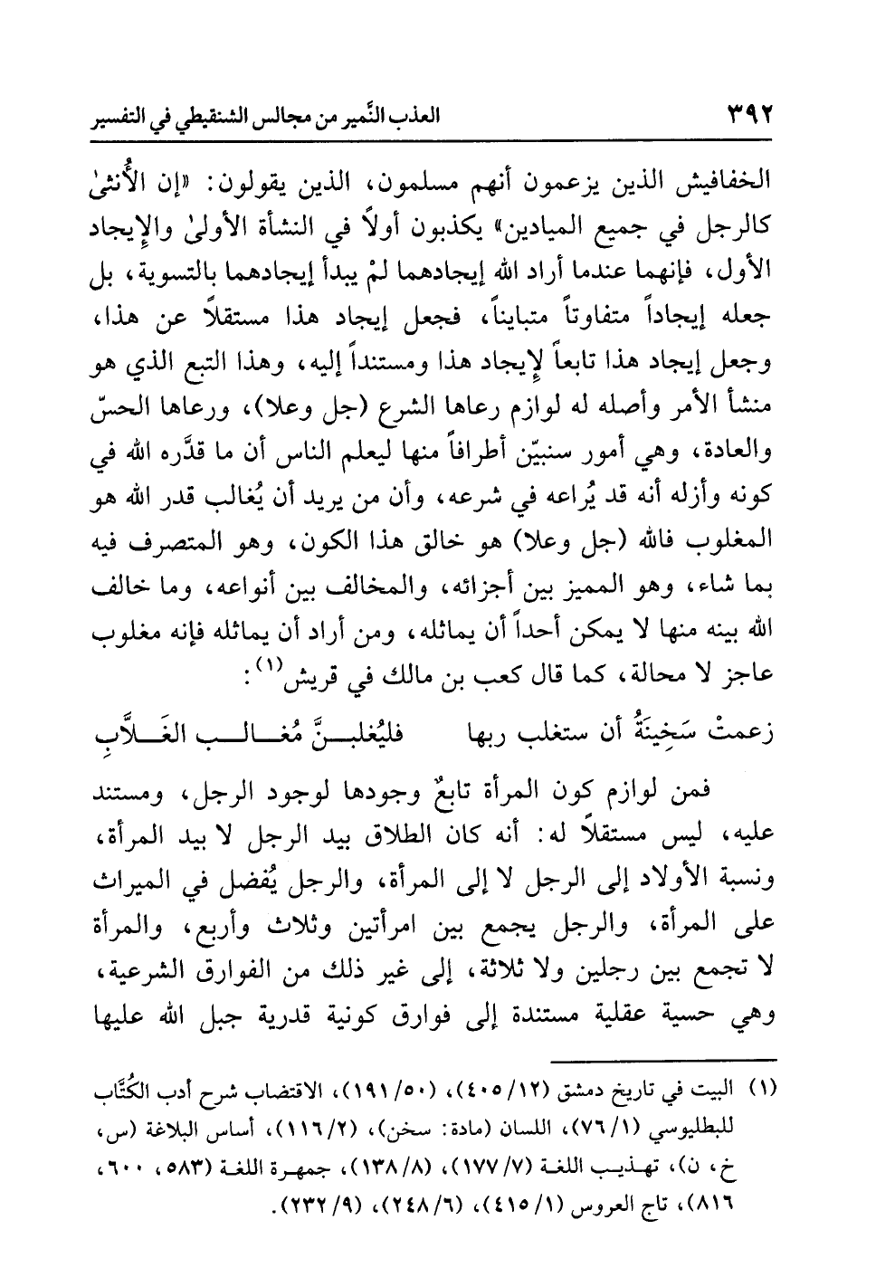الخفافيش الذين يزعمون أنهم مسلمون، الذين يقولون: (إن الأُنثى كالرجل في جميع الميادين) يكذبون أولاً في النشأة الأولى والإيجاد الأول، فإنهما عندما أراد الله إيجادهما لمْ يبدأ إيجادهما بالتسوية، بل جعله إيجادًا متفاوتًا متباينًا، فجعل إيجاد هذا مستقلاًّ عن هذا، وجعل إيجاد هذا تابعًا لإيجاد هذا ومستندًا إليه، وهذا التبع الذي هو منشأ الأمر وأصله له لوازم رعاها الشرع (جل وعلا) ورعاها الحسّ والعادة، وهي أمور سنبيّن أطرافًا منها ليعلم الناس أن ما قدَّره الله في كونه وأزله أنه قد يُراعه في شرعه، وأَنَّ مَنْ يُريدُ أنْ يُغالب قدر الله هو المغْلُوب؛ فَالله (جل وعلا) هو خالق هذا الكون، وهو المتصرِّف فيه بما شاء، وهو المميز بين أجْزَائِهِ، والمخالف بين أنْوَاعِه، وما خالف الله بينه منها لا يمكن أحدًا أن يماثله، ومن أراد أن يماثله فإنه مغلوب عاجز لا محالة، كما قال كعب بن مالك في قريش (¬1):
