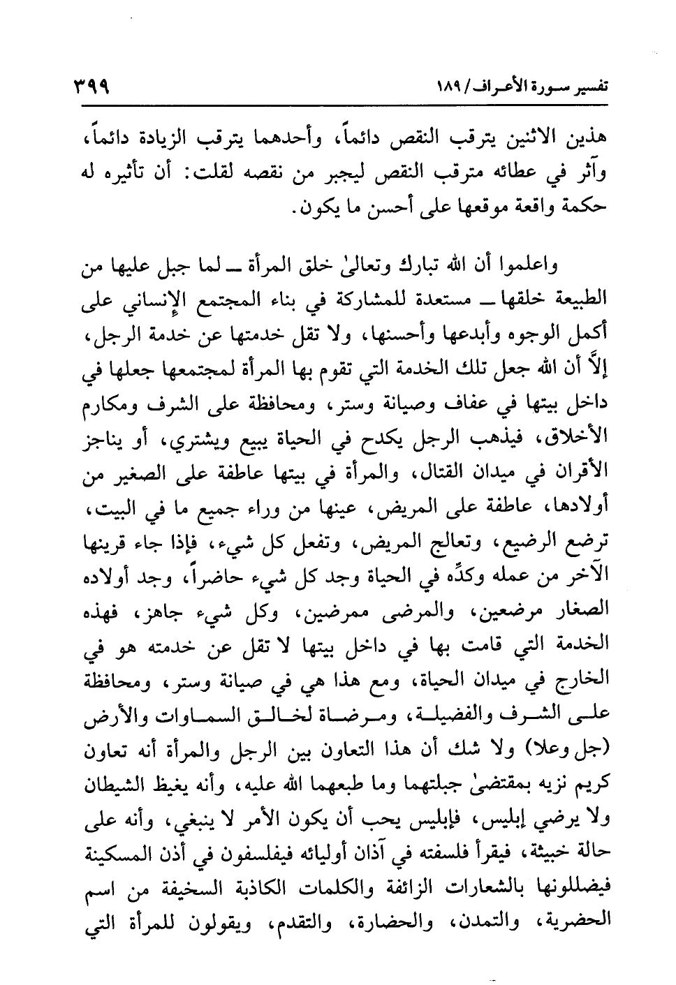واعلموا أن الله تبارك وتعالى خلق المرأة -لما جبلها عليه من الطبيعة- مستعدة للمشاركة في بناء المجتمع الإنساني على أكمل الوجوه وأبدعها وأحسنها، ولا تَقِلُّ خدمتها عن خدمة الرجل، إلاَّ أن الله جعل تلك الخدمة التي تقوم بها المرأة لمجتمعها جعلها في داخل بيتها في عفاف وصيانة وستر، ومحافظة على الشرف ومكارم الأخلاق، فيذهب الرجل يكدح في الحياة يبيع ويشتري، أو يناجز الأقران في ميدان القتال، والمرأة في بيتها عاطفة على الصغير من أولادها، عاطفة على المريض، عينها من وراء جميع ما في البيت، ترضع الرضيع، وتعالج المريض، وتفعل كل شيء، فإذا جاء قرينها الآخر من عمله وكدِّه في الحياة وجد كل شيء حاضرًا، وجد أولاده الصغار مرضعين، والمرضى ممرضين، وكل شيء جاهز، فهذه الخدمة التي قامت بها في داخل بيتها لا تقل عن خدمته هو في الخارج في ميدان الحياة، ومع هذا هي في صيانة وستر، ومحافظة على الشرف والفضيلة، ومرضاة لخالق السماوات والأرض (جل وعلا) ولا شك أن هذا التعاون بين الرجل والمرأة أنه تعاون كريم نزيه بمقتضى جبلتهما وما طبعهما الله عليه، وأنه يغيظ الشيطان ولا يرضي إبليس، فإبليس يحب أن يكون الأمر لا ينبغي، وأنه على حالة خبيثة، فيقرأ فلسفته في آذان أوليائه فيفلسفون في أذن المسكينة فيضللونها بالشعارات الزائفة والكلمات الكاذبة السخيفة من اسم الحضرية، والتمدن، والحضارة، والتقدم، ويقولون للمرأة التي