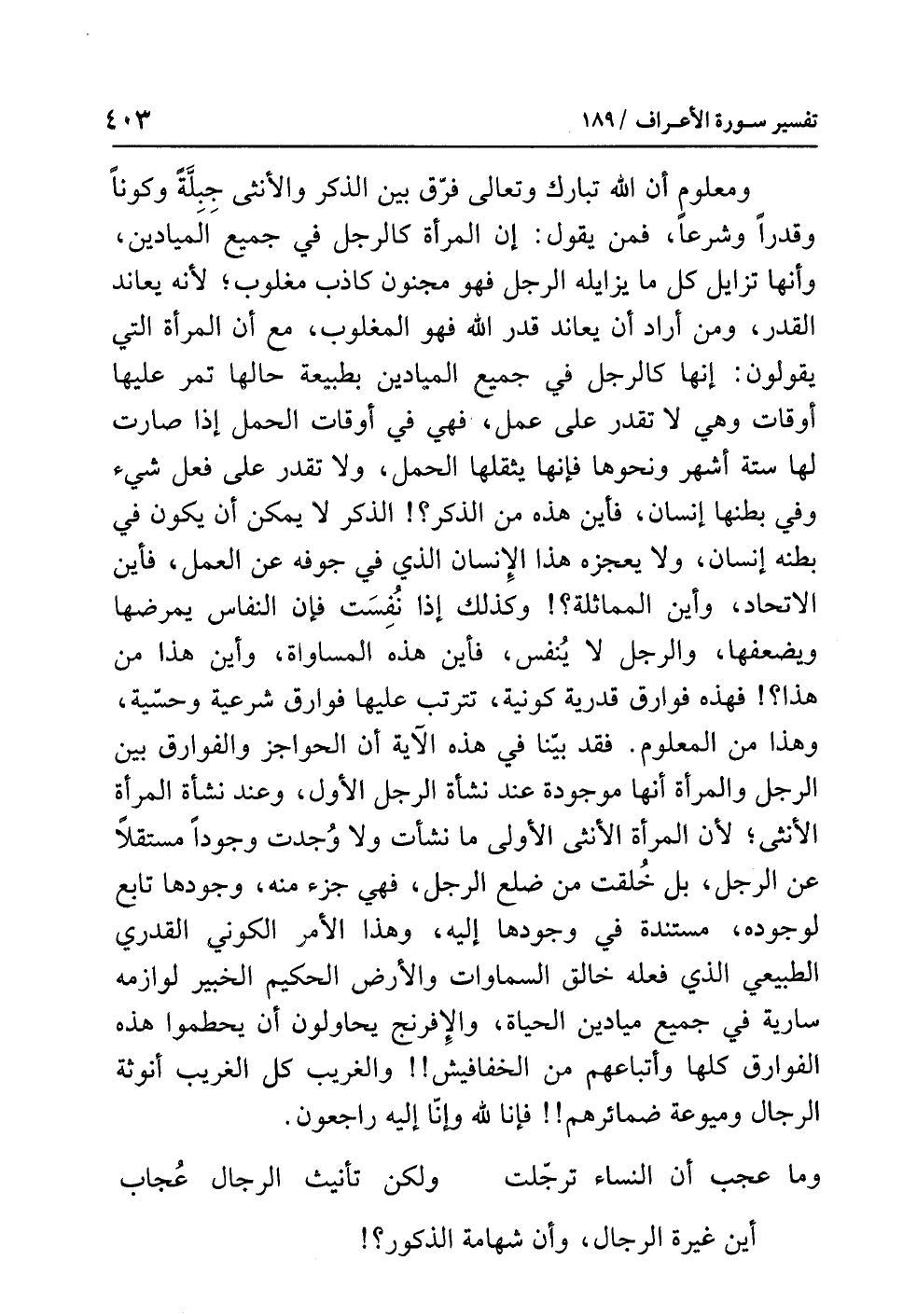 ومعلوم أن الله تبارك وتعالى فَرَّقَ بَيْنَ الذَّكَرِ والأنْثَى جِبلَّةً وكونًا وقدرًا وشرعًا، فمن يقول: إن المرأة كالرجل في جميع الميادين، وأنها تزايل ما يزايله الرجل فهو مجنون كاذب مغلوب؛ لأنه يعاند القدر، ومن أراد أن يعاند قدر الله فهو المغلوب، مع أن المرأة التي يقولون: إنها كالرجل في جميع الميادين بطبيعة حالها تمر عليها أوقات وهي لا تقدر على عمل، فهي في أوقات الحمل إذا صارت لها ستة أشهر ونحوها فإنها يُثْقِلها الحمل، ولا تقدر على فعل شيء وفي بطنها إنسان، فأين هذه من الذكر؟! الذكر لا يمكن أن يكون في بطنه إنسان، ولا يعجزه هذا الإنسان الذي في جوفه عن العمل، فأين الاتحاد، وأين المماثلة؟! وكذلك إذا نُفِسَت فإن النفاس يمرضها ويضعفها، والرجل لا يُنفس، فأين هذه المساواة، وأين هذا من هذا؟! فهذه فوارق قدرية كونية، تترتب عليها فوارق شرعية وحسِّية، وهذا من المعلوم. فقد بيّنا في هذه الآية أن الحواجز والفوارق بين الرجل والمرأة أنها موجودة عند نشأة الرجل الأول، وعند نشأة المرأة الأنثى؛ لأن المرأة الأنثى الأولى ما نشأت ولا وُجدت وجودًا مستقلاً عن الرجل، بل خُلِقَتْ من ضلع الرجل، فهي جزء منه، وجودها تابع لوجوده، مستندة في وجودها إليه، وهذا الأمر الكوني القدري الطبيعي الذي فعله خالق السماوات والأرض الحكيم الخبير لوازمه سارية في جميع ميادين الحياة، والإفرنج يحاولون أن يحطموا هذه الفوارق كلها وأتباعهم من الخفافيش!! والغريب كل الغريب أنوثة الرجال وميوعة ضمائرهم!! فإنا لله وإنّا إليه راجعون.