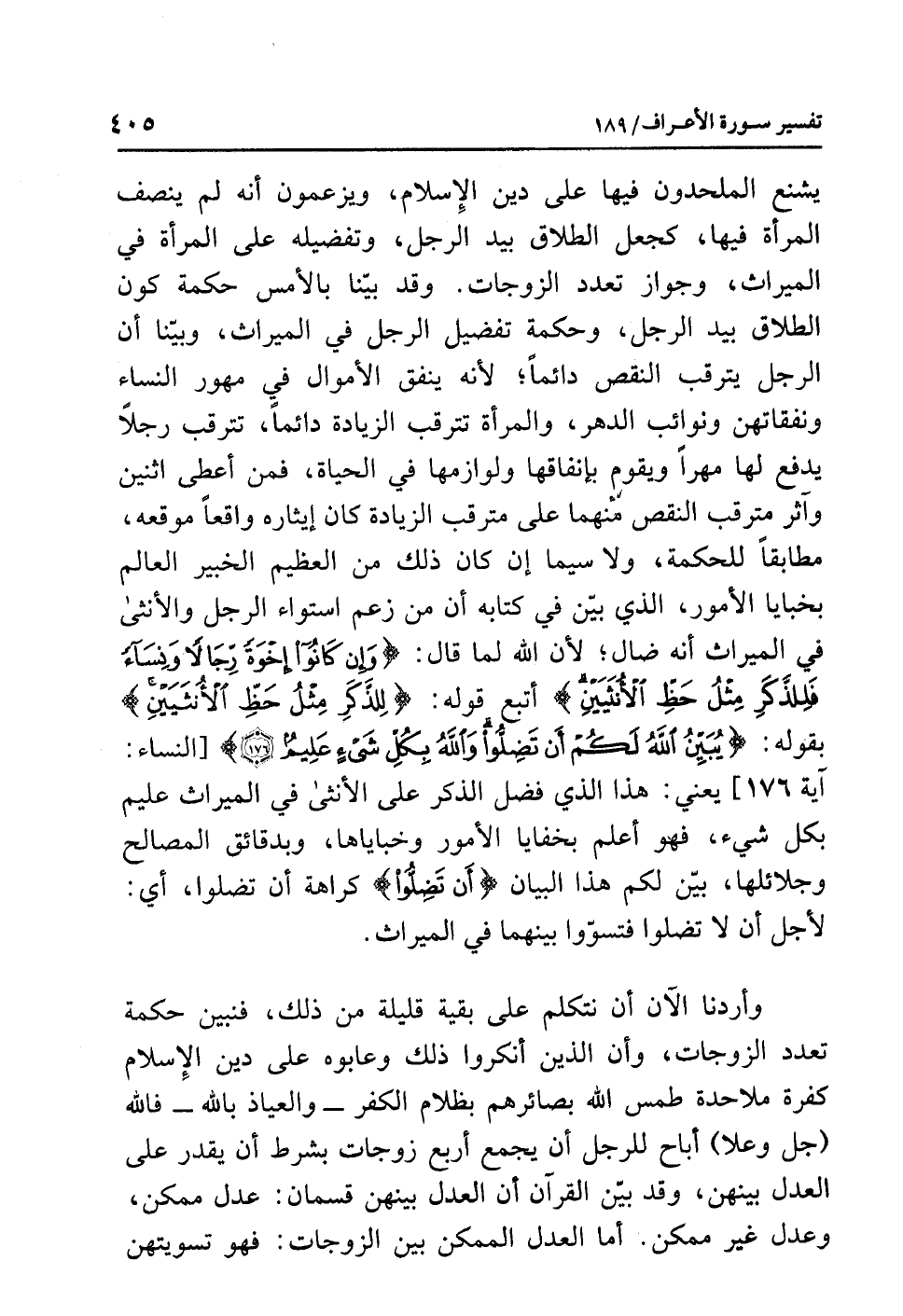 وقد بيّنا حكمة كون الطلاق بيد الرجل، وحكمة تفضيل الرجل في الميراث، وبيّنا أن الرجل يترقب النقص دائمًا؛ لأنه ينفق الأموال في مهور النساء ونفقاتهن ونوائب الدهر، والمرأة تتَرَقَّبُ الزِّيَادَة دائمًا، تترقب رجلاً يدفع لها مهرًا ويقوم بإِنْفَاقِهَا ولوازِمها في الحياة، فمن أعطى اثنين وآثر مترقب النقص منهما على مترقب الزيادة كان إيثاره واقعًا موقعه، مطابقًا للحكمة، ولا سيما إن كان ذلك من العظيم الخبير العالم بخبايا الأمور، الذي بيّن في كتابه أَنَّ مَنْ زَعَمَ اسْتِوَاءَ الرَّجُل والأنثى في الميراث أنه ضال؛ لأن الله لما قال: {وَإِن كَانُواْ إِخْوَةً رِّجَالاً وَنِسَاء فَلِلذَّكَرِ مِثْلُ حَظِّ الأُنثَيَيْنِ} أتبع قوله: {لِلذَّكَرِ مِثْلُ حَظِّ الأُنثَيَيْنِ} بقوله: {يُبَيِّنُ اللَّهُ لَكُمْ أَن تَضِلُّواْ وَاللَّهُ بِكُلِّ شيء عَلِيمٌ} [النساء: آية 176] يعني: هذا الذي فضل الذكر على الأنثى في الميراث عليم بكل شيء، فهو أعلم بخفايا الأمور وخباياها، وبدقائق المصالح وجلائلها، بيّن لكم هذا البيان {أَن تَضِلُّواْ} كراهة أن تضلوا، أي: لأجل أن لا تضلوا فتسوّوا بينهما في الميراث.