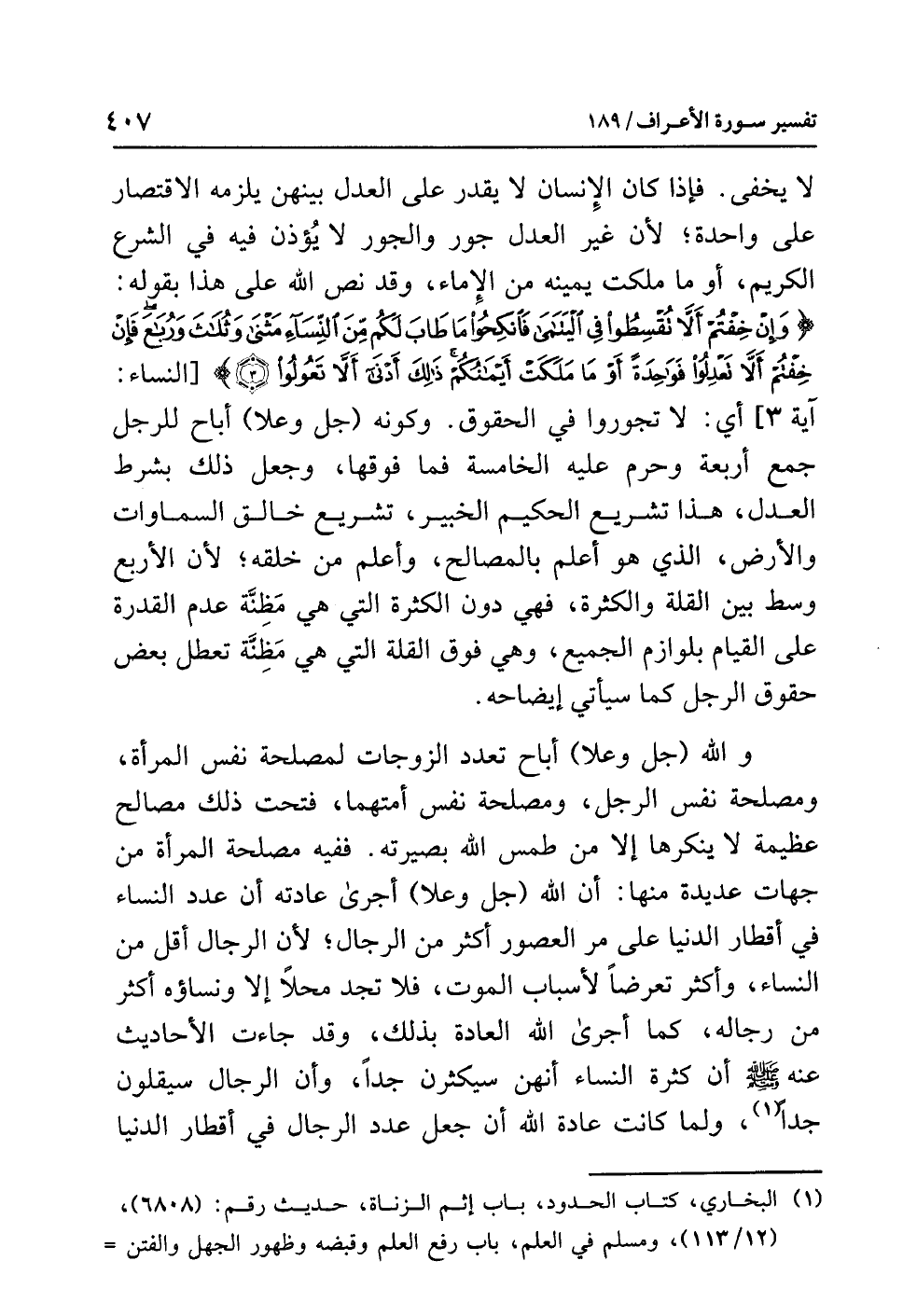 لا يخفى. فإذا كان الإنسان لا يقدر على العدل بينهن يلزمه الاقتصار على واحدة؛ لأن غير العدل جور والجور لا يُؤذن فيه في الشرع الكريم، أو ما ملكت يمينه من الإماء، وقد نص الله على هذا بقوله: {وَإِنْ خِفْتُمْ أَلاَّ تُقْسِطُواْ فِي الْيَتَامَى فَانكِحُواْ مَا طَابَ لَكُم مِّنَ النِّسَاء مَثْنَى وَثُلاَثَ وَرُبَاعَ فَإِنْ خِفْتُمْ أَلاَّ تَعْدِلُواْ فَوَاحِدَةً أَوْ مَا مَلَكَتْ أَيْمَانُكُمْ ذَلِكَ أَدْنَى أَلاَّ تَعُولُواْ (3)} [النساء: آية 3] أي: لا تجوروا في الحقوق. وكونه (جل وعلا) أباح للرجل جمع أربعة وحرم عليه الخامسة فما فوقها، وجعل ذلك بشرط العدل، هذا تشريع الحكيم الخبير، تشريع خالق السماوات والأرض، الذي هو أعلم بالمصالح، وأعلم من خلقه؛ لأن الأربع وسط بين القلة والكثرة، فهي دون الكثرة التي هي مَظِنَّة عدم القدرة على القيام بلوازم الجميع، وهي فوق القلة التي هي مَظِنَّة تعطل بعض حقوق الرجل كما سيأتي إيضاحه.