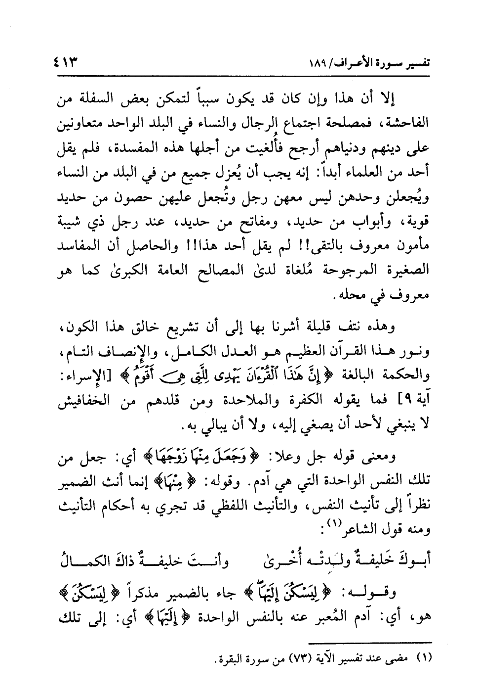 وقوله: {لِيَسْكُنَ إِلَيْهَا} جاء بالضمير مذكرًا {لِيَسْكُنَ} هو، أي: آدم المُعبر عنه بالنفس الواحدة {إِلَيْهَا} أي: إلى تلك