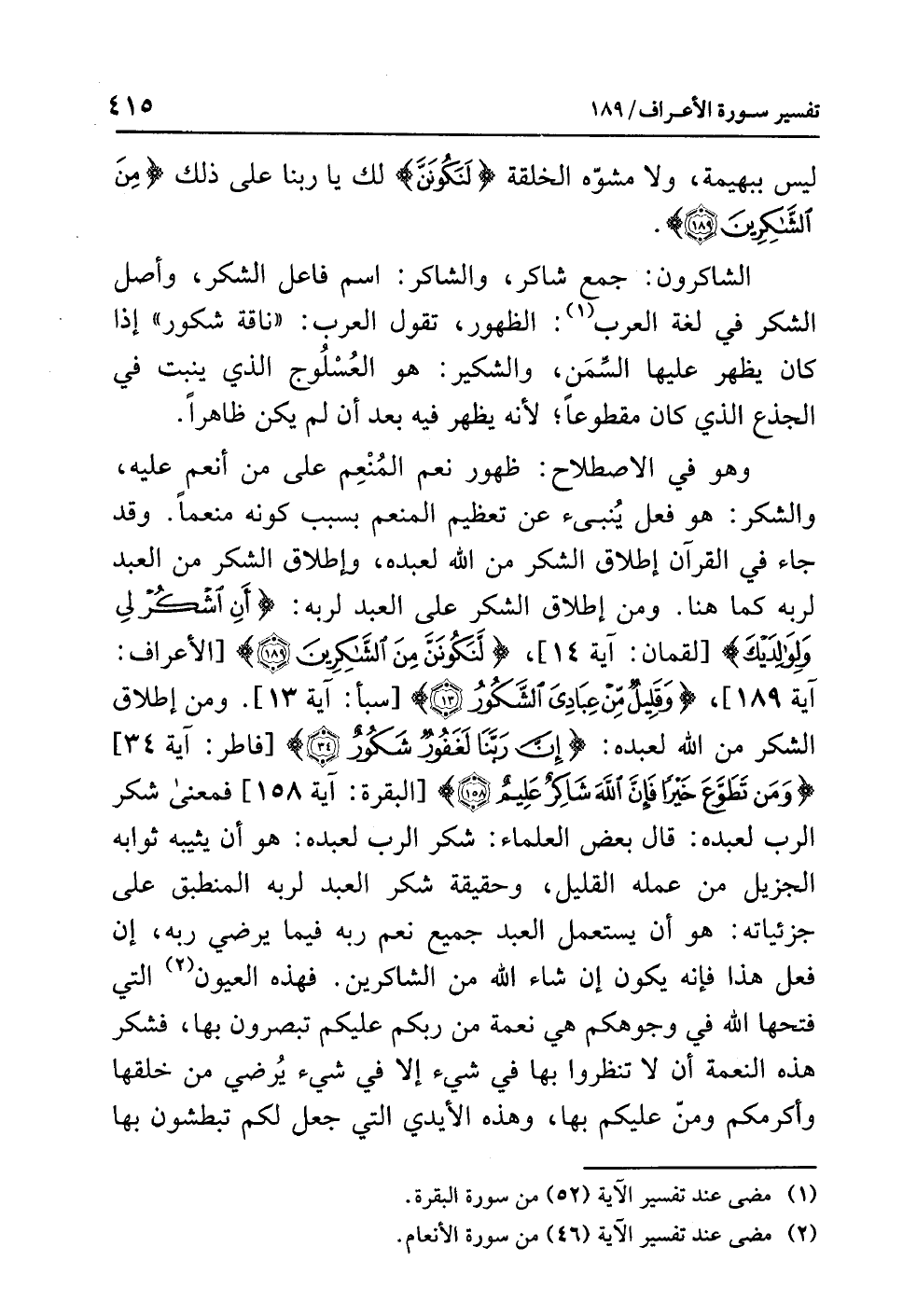 وهو في الاصطلاح: ظهور نعم المُنْعِم على من أنعم عليه، والشكر: هو فعل يُنبئ عن تعظيم المنعم بسبب كونه منعمًا. وقد جاء في القرآن إطلاق الشكر من الله لعبده، وإطلاق الشكر من العبد لربه كما هنا. ومن إطلاق الشكر على العبد لربه: {أَنِ اشْكُرْ لِي وَلِوَالِدَيْكَ} [لقمان: آية 14] {لَّنَكُونَنَّ مِنَ الشَّاكِرِينَ} [الأعراف: آية 189] {وَقَلِيلٌ مِّنْ عِبَادِيَ الشَّكُورُ} [سبأ: آية 13]. ومن إطلاق الشكر من الله لعبده: {إِنَّ رَبَّنَا لَغَفُورٌ شَكُورٌ} [فاطر: آية 34] {وَمَن تَطَوَّعَ خَيْرًا فَإِنَّ اللَّهَ شَاكِرٌ عَلِيمٌ} [البقرة: آية 158] فمعنى شكر الرب لعبده: قال بعض العلماء: شكر الرب لعبده: هو أن يثيبه ثوابه الجزيل من عمله القليل، وحقيقة شكر العبد لِرَبِّهِ المنطبق على جزئياته: هو أن يستعمل العبد جميع نعم ربه فيما يُرْضِي رَبَّهُ، إن فعل هذا فإنه يكون إن شاء الله مِنَ الشَّاكِرِين. فهذه العيون (¬2) التي فتحها الله في وجوهكم هي نعمة من ربكم عليكم تبصرون بها، فَشُكْرُ هَذِهِ النِّعْمَة أن لا تنظروا بها في شيء إلا في شيء يُرضي من خلقها وأكرمكم ومَنَّ عليكم بها، وهذه الأيدي التي جعل لكم تبطشون بها