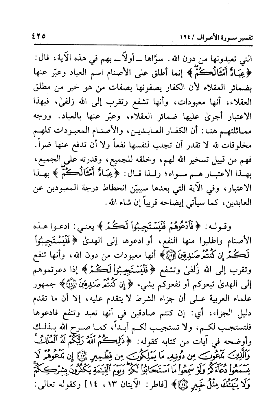 التي تعبدونها من دون الله، سوَّاها أولاً بهم في هذه الآية، قال: {عِبَادٌ أَمْثَالُكُمْ} إنما أطلق على الأصنام اسم العباد وعبّر عنها بضمائر العقلاء؛ لأن الكفار يصفونها بصفات من هو خير من مطلق العقلاء، أنها معبودات، وأنها تشفع وتقرِّبُ إلى اللهِ زُلْفَى، فبهذا الاعتبار أجرى عليها ضمائر العقلاء، وعبّر عنها بالعباد. ووجه مماثلتهم هنا: أن الكفار العابدين، والأصنام المعبودات كلهم مخلوقات لله لا تقدر أن تجلب لنفسها نفعًا ولا أن تدفع عنها ضرًّا. فهم من قبيل تَسْخِيرِ الله لهم، وخلقه للجميع، وقدرته على الجميع، بهذا الاعتبار هم سواء؛ ولذا قال: {عِبَادٌ أَمْثَالُكُمْ} بهذا الاعتبار، وفي الآية التي بعدها سيبيّن انحطاط درجة المعبودين عن العابدين، كما سيأتي إيضاحه قريبًا إن شاء الله.
