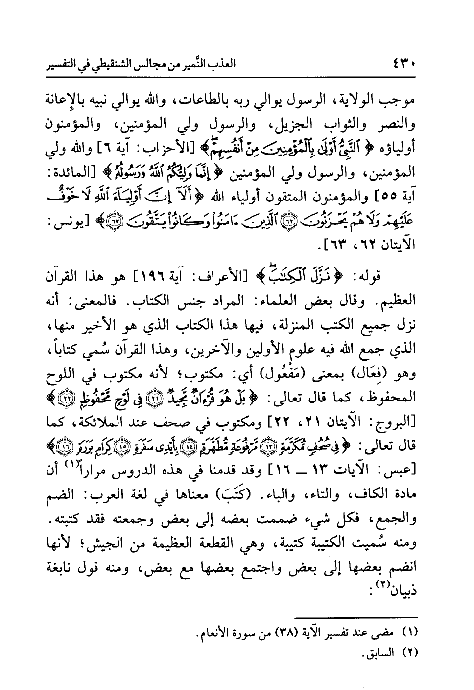 قوله: {نَزَّلَ الْكِتَابَ} [الأعراف: آية 196] هو هذا القرآن العظيم. وقال بعض العلماء: المراد جنس الكتاب. فالمعنى: أنه نزل جميع الكتب المنزلة، فيها هذا الكتاب الذي هو الأخير منها، الذي جمع الله فيه علوم الأولين والآخرين، وهذا القرآن سُمي كتابًا، وهو (فِعَال) بمعنى (مَفْعُول) أي: مكتوب؛ لأنه مكتوب في اللوح المحفوظ، كما قال تعالى: {بَلْ هُوَ قُرْآنٌ مَّجِيدٌ (21) فِي لَوْحٍ مَّحْفُوظٍ (22)} [البروج: الآيتان 21، 22] ومكتوب في صحف عند الملائكة، كما قال تعالى: {فِي صُحُفٍ مُّكَرَّمَةٍ (13) مَّرْفُوعَةٍ مُّطَهَّرَةٍ (14) بِأَيْدِي سَفَرَةٍ (15) كِرَامٍ بَرَرَةٍ (16)} [عبس: الآيات 13 - 16] وقد قدمنا في هذه الدروس مرارًا (¬1) أن مادة الكاف، والتاء، والباء. (كَتَبَ) معناها في لغة العرب: الضم والجمع، فكل شيء ضممت بعضه إلى بعض وجمعته فقد كتبته. ومنه سُميت الكتيبة كتيبة، وهي القطعة العظيمة من الجيش؛ لأنها انضم بعضها إلى بعض واجتمع بعضها مع بعض، ومنه قول نابغة ذبيان (¬2):