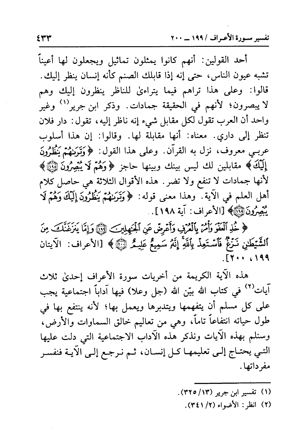 هذه الآية الكريمة من أخريات سورة الأعراف إحدى ثلاث آيات (¬2) في كتاب الله بيّن الله (جل وعلا) فيها آدابًا اجتماعية يجب على كل مسلم أن يتفهمها ويتدبرها ويعمل بها؛ لأنه ينتفع بها في طول حياته انتفاعًا تامًّا، وهي من تعاليم خالق السماوات والأرض، وسنلم بهذه الآيات ونذكر هذه الآداب الاجتماعية التي دَلَّتْ عَلَيْهَا التي يحتاج إلى تعليمها كل إنسان، ثم نرجع إلى الآية فنفَسِّر مُفْرَدَاتها.