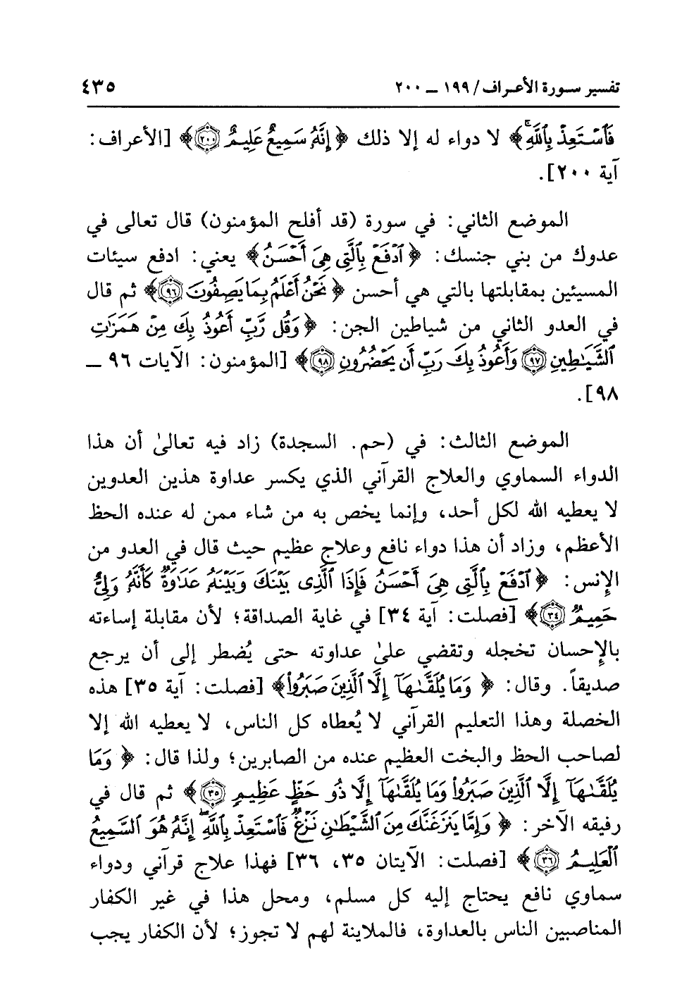 الموضع الثالث: في (حم السجدة) زاد فيه تعالى أن هذا الدواء السماوي والعلاج القرآني الذي يَكْسِر عداوَةَ هَذَيْنِ العَدُوَّيْنِ لا يُعْطِيهِ الله لكلِّ أحد، وإنما يخص به مَنْ شَاءَ مِمَّنْ لَهُ عِنْدَهُ الحَظّ الأعْظَم، وزاد أن هذا دواء نافع وعلاج عظيم حيث قال في العدو من الإنس: {ادْفَعْ بِالَّتِي هِيَ أَحْسَنُ فَإِذَا الَّذِي بَيْنَكَ وَبَيْنَهُ عَدَاوَةٌ كَأَنَّهُ وَلِيٌّ حَمِيمٌ} [فصلت: آية 34] في غاية الصداقة؛ لأن مقابلة إساءته بالإحسان تخجله وتقضي على عداوته حتى يُضطر إلى أن يرجع صديقًا.