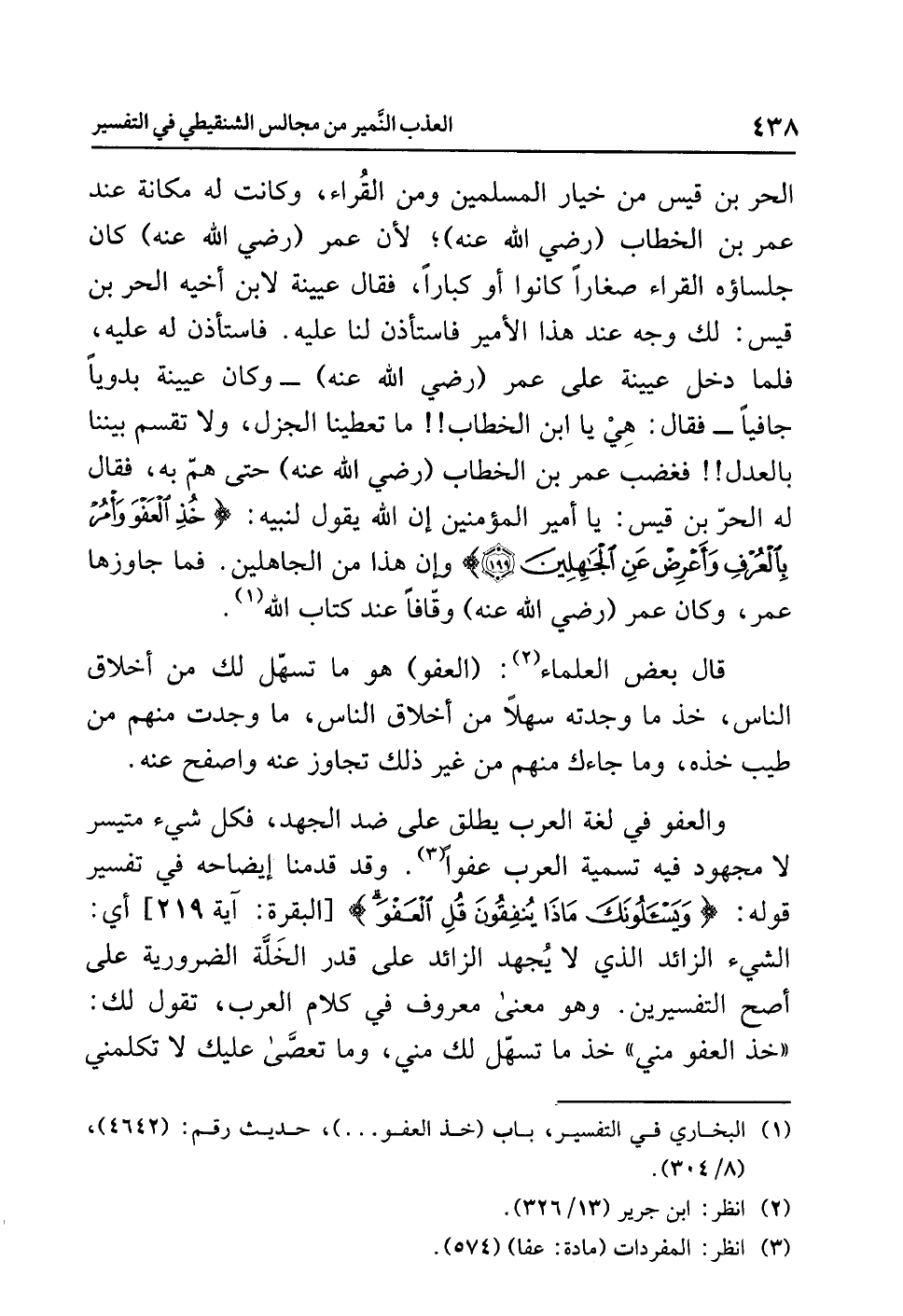قال بعض العلماء (¬2): (العفو) هو ما تسهّل لك من أخلاق الناس، خذ ما وجدته سهلاً من أخلاق الناس، ما وجدت منهم من طيب خذه، وما جاءك منهم من غير ذلك تجاوز عنه واصفح عنه.