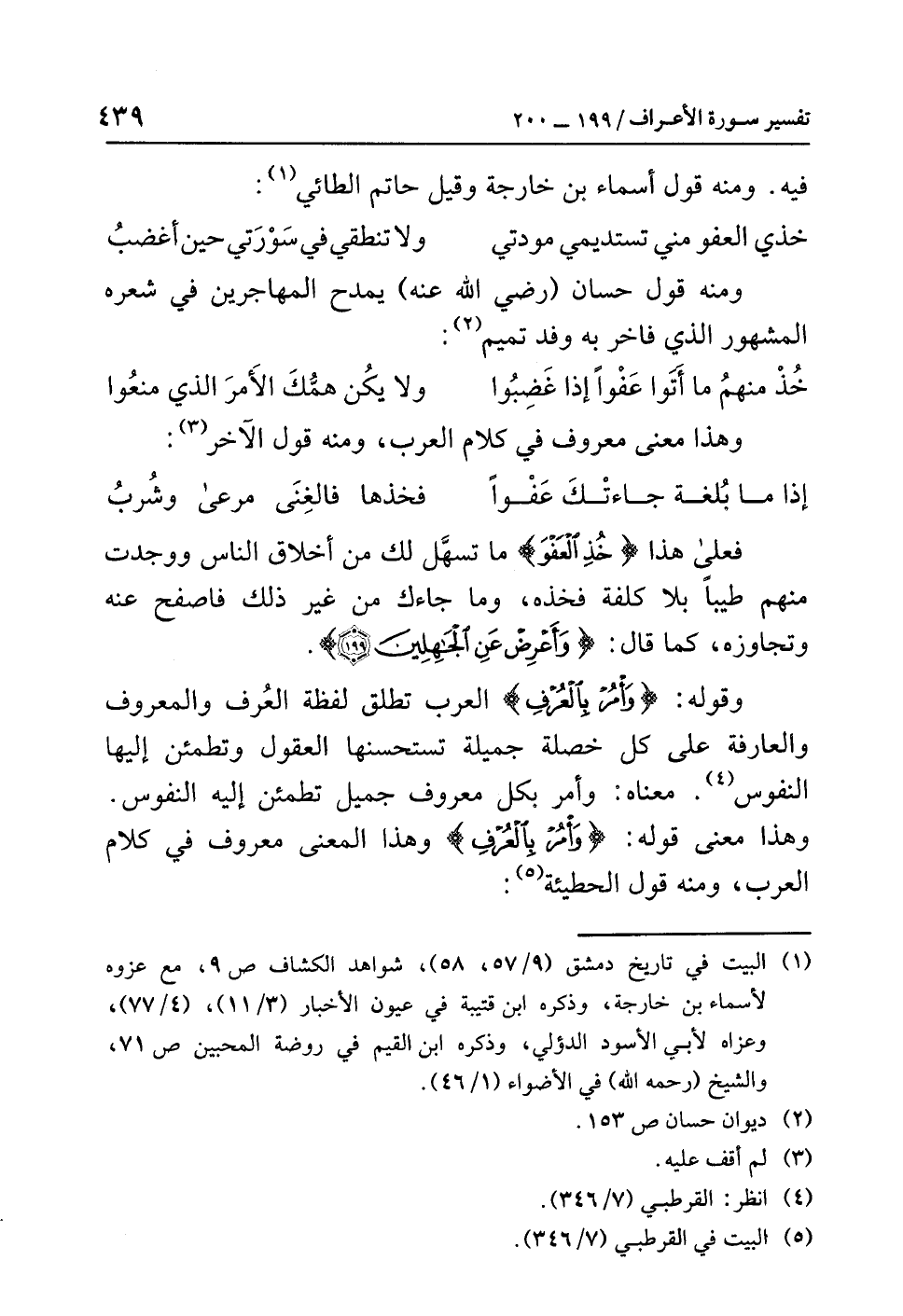 وقوله: {وَأْمُرْ بِالْعُرْفِ} العرب تطلق لفظة العُرف والمعروف والعارفة على كل خصلة جميلة تستحسنها العقول وتطمئن إليها النفوس (¬4). معناه: وأمر بكل معروف جميل تطمئن إليه النفوس. وهذا معنى قوله: {وَأْمُرْ بِالْعُرْفِ} وهذا المعنى معروف في كلام العرب، ومنه قول الحطيئة (¬5):