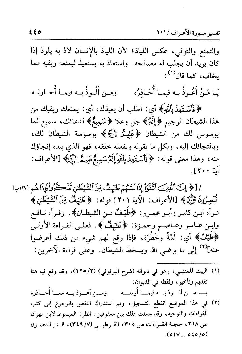 [27/ب] / [{إِنَّ الَّذِينَ اتَّقَواْ إِذَا مَسَّهُمْ طَائِفٌ مِّنَ الشَّيْطَانِ تَذَكَّرُواْ فَإِذَا هُم مُّبْصِرُونَ (201)} [الأعراف: الآية 201] قوله: {طَائِفٌ مِّنَ الشَّيْطَانِ} قرأه ابن كثير وأبو عمرو: {طَيْفٌ من الشَّيْطَانِ}. وقرأه نافع وابن عامر وعاصم وحمزة: {طَيْفٌ}. فعلى القراءة الأولى {إِذَا مَسَّهُمْ طَائِفٌ مِّنَ الشَّيْطَانِ} أي: لَمَّةٌ وخَطْرَة، فإذا وقع لهم شيء من ذلك أعرضوا عنه] (¬2) إلى ما يرضي الله ويسخط الشيطان. وعلى قراءة الآخرين: