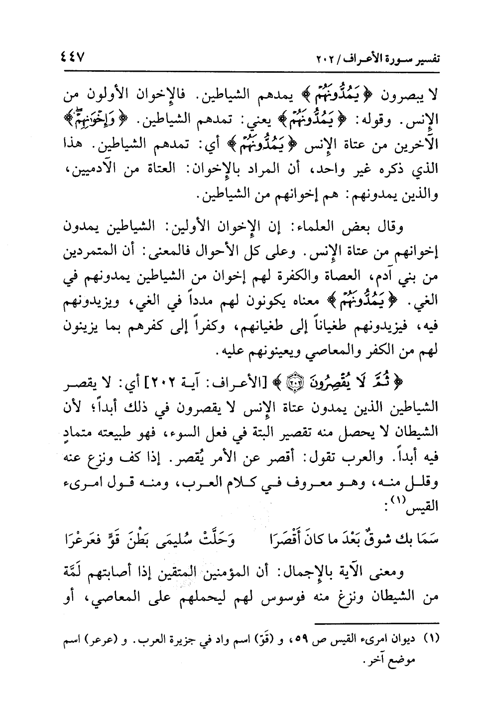 {ثُمَّ لاَ يُقْصِرُونَ} [الأعراف: آية 202]، أي: لا يقصر الشياطين الذين يمدون عتاة الإنس لا يقصرون في ذلك أبدًا؛ لأن الشيطان لا يحصل منه تقصير البتة في فعل السوء، فهو طبيعته مُتَمَادٍ فيه أبدًا. والعرب تقول: أقْصَرَ عَنِ الأمْرِ يُقْصِرُ: إذا كَفَّ ونَزَع عنه وقلَّلَ منه، وهو معروف في كلام العرب، ومنه قول امرئ القيس (¬1):