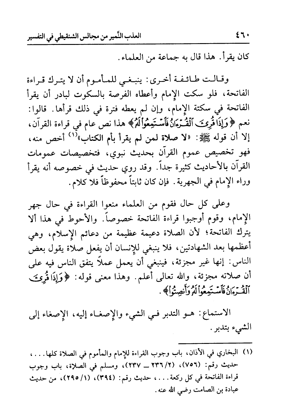 وعلى كل حال فقوم من العلماء منعوا القراءة في حال جهر الإمام، وقوم أوجبوا قراءة الفاتحة خصوصًا. والأحوط في هذا ألا يترك الفاتحة؛ لأن الصلاة دعيمة عظيمة من دعائم الإسلام، وهي أعظمها بعد الشهادتين، فلا ينبغي للإنسان أن يفعل صلاة يقول بعض الناس: إنها غير مجزئة، فينبغي أن يعمل عملاً يتفق الناس فيه على أن صلاته مجزئة، والله تعالى أعلم. وهذا معنى قوله: {وَإِذَا قُرِئَ الْقُرْآنُ فَاسْتَمِعُواْ لَهُ وَأَنصِتُواْ}.