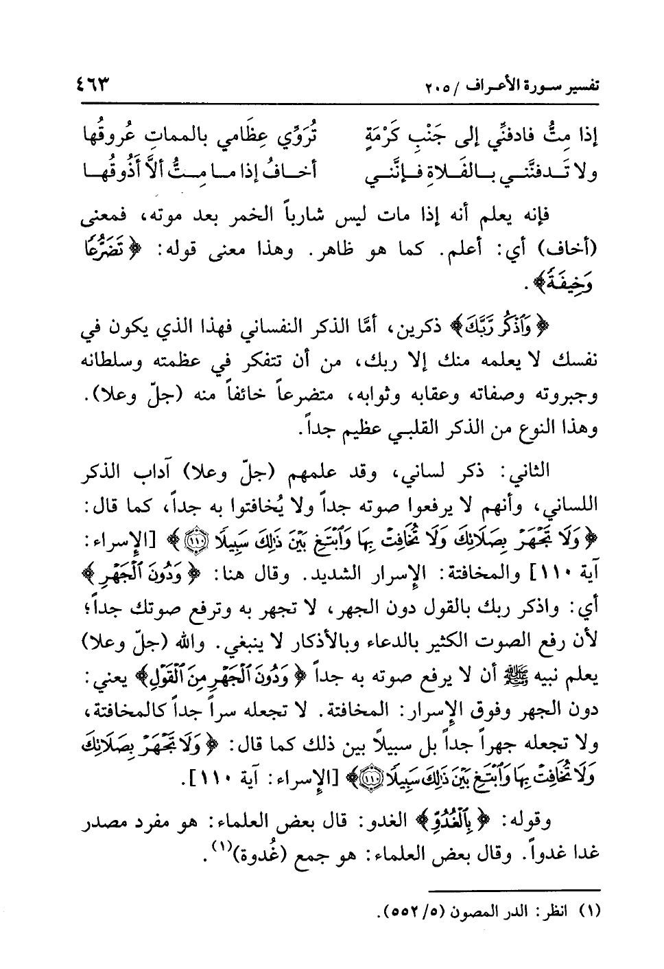الثاني: ذكر لساني، وقد علمهم (جلّ وعلا) آداب الذكر اللساني، وأنهم لا يرفعوا صوته جدًّا ولا يُخافتوا به جدًّا، كما قال: {وَلاَ تَجْهَرْ بِصَلاَتِكَ وَلاَ تُخَافِتْ بِهَا وَابْتَغِ بَيْنَ ذَلِكَ سَبِيلاً} [الإسراء: آية 110] والمخافتة: الإسرار الشديد. وقال هنا: {وَدُونَ الْجَهْرِ} أي: واذكر ربك بالقول دون الجهر، لا تجهر به وترفع صوتك جدًّا؛ لأن رفع الصوت الكثير بالدعاء وبالأذكار لا ينبغي. والله (جلّ وعلا) يُعَلِّمُ نبيَّه صلى الله عليه وسلم أن لا يرفع صوته به جدًّا {وَدُونَ الْجَهْرِ مِنَ الْقَوْلِ} يعني: دون الجهر وفوق الإسرار: المخافتة، لا تجعله سرًّا جدًّا كالمخافتة، ولا تجعله جهرًا جدًّا بل سبيلاً بين ذلك كما قال: {وَلاَ تَجْهَرْ بِصَلاَتِكَ وَلاَ تُخَافِتْ بِهَا وَابْتَغِ بَيْنَ ذَلِكَ سَبِيلاً} [الإسراء: آية 110].