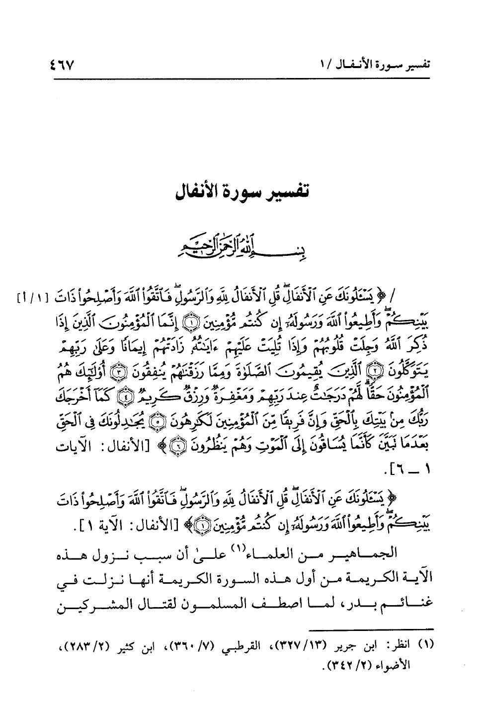 [1/أ] / ... {يَسْأَلُونَكَ عَنِ الأَنفَالِ قُلِ الأَنفَالُ للهِ وَالرَّسُولِ فَاتَّقُواْ اللَّهَ وَأَصْلِحُواْ ذَاتَ بِيْنِكُمْ وَأَطِيعُواْ اللَّهَ وَرَسُولَهُ إِن كُنتُم مُّؤْمِنِينَ (1) إِنَّمَا الْمُؤْمِنُونَ الَّذِينَ إِذَا ذُكِرَ اللَّهُ وَجِلَتْ قُلُوبُهُمْ وَإِذَا تُلِيَتْ عَلَيْهِمْ آيَاتُهُ زَادَتْهُمْ إِيمَانًا وَعَلَى رَبِّهِمْ يَتَوَكَّلُونَ (2) الَّذِينَ يُقِيمُونَ الصَّلاَةَ وَمِمَّا رَزَقْنَاهُمْ يُنفِقُونَ (3) أُوْلَئِكَ هُمُ الْمُؤْمِنُونَ حَقًّا لَّهُمْ دَرَجَاتٌ عِندَ رَبِّهِمْ وَمَغْفِرَةٌ وَرِزْقٌ كَرِيمٌ (4) كَمَا أَخْرَجَكَ رَبُّكَ مِن بَيْتِكَ بِالْحَقِّ وَإِنَّ فَرِيقًا مِّنَ الْمُؤْمِنِينَ لَكَارِهُونَ (5) يُجَادِلُونَكَ فِي الْحَقِّ بَعْدَ مَا تَبَيَّنَ كَأَنَّمَا يُسَاقُونَ إِلَى الْمَوْتِ وَهُمْ يَنظُرُونَ (6)} [الأنفال: الآيات 1 - 6].