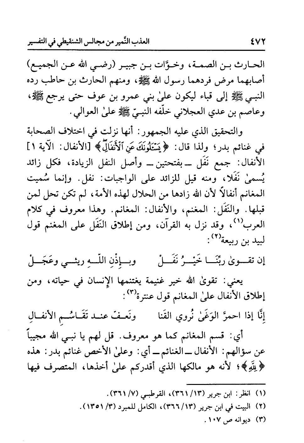 والتحقيق الذي عليه الجمهور: أنها نزلت في اختلاف الصحابة في غنائم بدر؛ ولذا قال: {يَسْأَلُونَكَ عَنِ الأَنفَالِ} [الأنفال: الآية 1] الأنفال: جمع نَفَل -بفتحتين- وأصل النفل الزيادة، فكل زائد يُسمى نَفَلاً، ومنه قيل للزائد على الواجبات: نفل. وإنما سُميت المغانم أنفالاً؛ لأن الله زادها من الحلال لهذه الأمة، لم تكن تحل لمن قبلها. والنَّفَل: المغنم، والأنفال: المغانم. وهذا معروف في كلام العرب (¬1)، وقد نزل به القرآن، ومن إطلاق النَفَل على المغنم قول لبيد بن ربيعة (¬2):