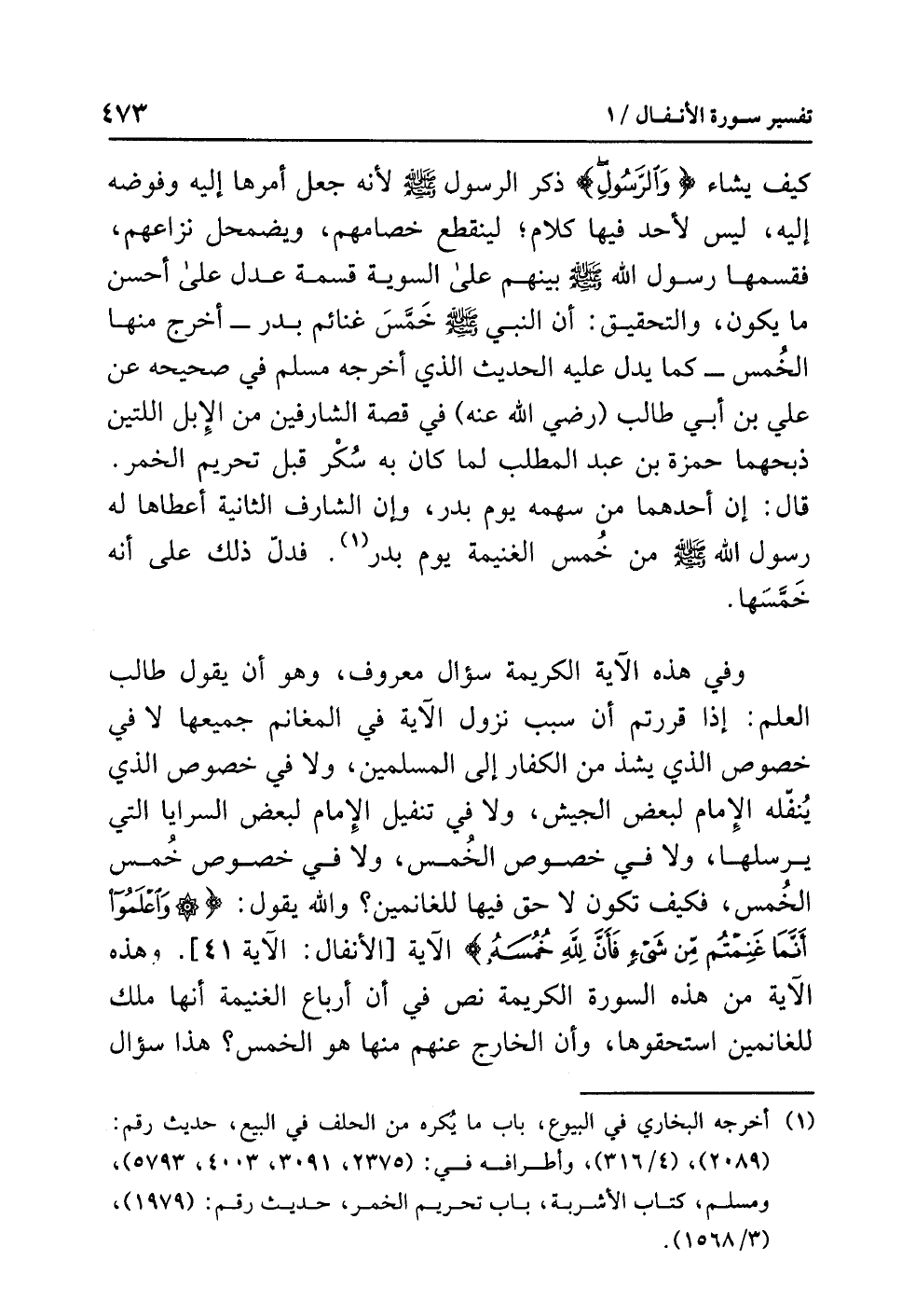 كيف يشاء {وَالرَّسُولِ} ذكر الرسول صلى الله عليه وسلم؛ لأنه جعل أمْرَهَا إليه وفَوَّضَه إليه، ليس لأحد فيها كلام؛ لينقطع خصامهم، ويضْمَحِلّ نِزَاعُهُمْ، فقسمها رسول الله صلى الله عليه وسلم بينهم على السوية قسمة عدل على أحسن ما يكون، والتحقيق: أن النبي صلى الله عليه وسلم خَمَّسَ غنائم بدر -أخرج منها الخُمس- كما يدل عليه الحديث الذي أخرجه مسلم في صحيحه عن علي بن أبي طالب (رضي الله عنه) في قصة الشارفين من الإبل اللتين ذبحهما حمزة بن عبد المطلب لما كان به سُكْر قبل تحريم الخمر. قال: إن أحدهما مِنْ سَهْمِه يوم بدر، وإن الشارف الثانية أعطاها له رسول الله صلى الله عليه وسلم من خُمْس الغنيمة يوم بدر (¬1). فدلّ ذلك على أنه خَمَّسَها.