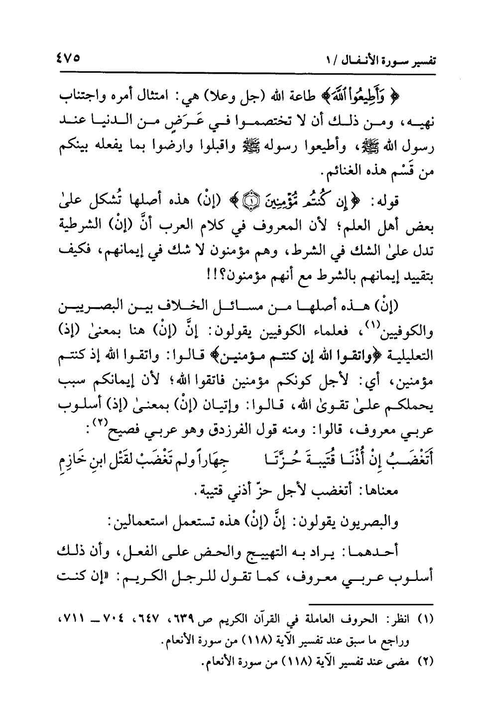 (إنْ) هذه أصلها من مسائل الخلاف بين البصريين والكوفيين (¬1)، فعلماء الكوفيين يقولون: إنَّ (إنْ) هنا بمعنى (إذ) التعليلية {واتَّقُوا اللهَ إِنْ كُنْتُمْ مؤْمِنينَ} قالوا: واتقوا الله إذ كنتم مؤمنين، أي: لأجل كونكم مؤمنين فاتقوا الله؛ لأن إيمانكم سبب يحملكم على تقوى الله، قالوا: وإتيان (إنْ) بمعنى (إذ) أسلوب عربي معروف، قالوا: ومنه قول الفرزدق وهو عربي فصيح (¬2):