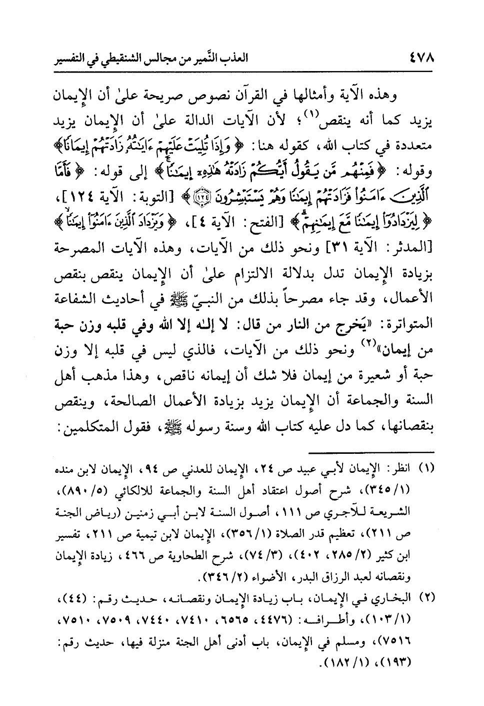 ونحو ذلك من الآيات، فالذي ليس في قلبه إلا وزن حبة أو شعيرة من إيمان فلا شك أن إيمانه ناقص، وهذا مذهب أهل السنة والجماعة أن الإيمان يزيد بزيادة الأعمال الصالحة، وينقص بنقصانها، كما دل عليه كتاب الله وسنة رسوله صلى الله عليه وسلم، فقول المتكلمين: