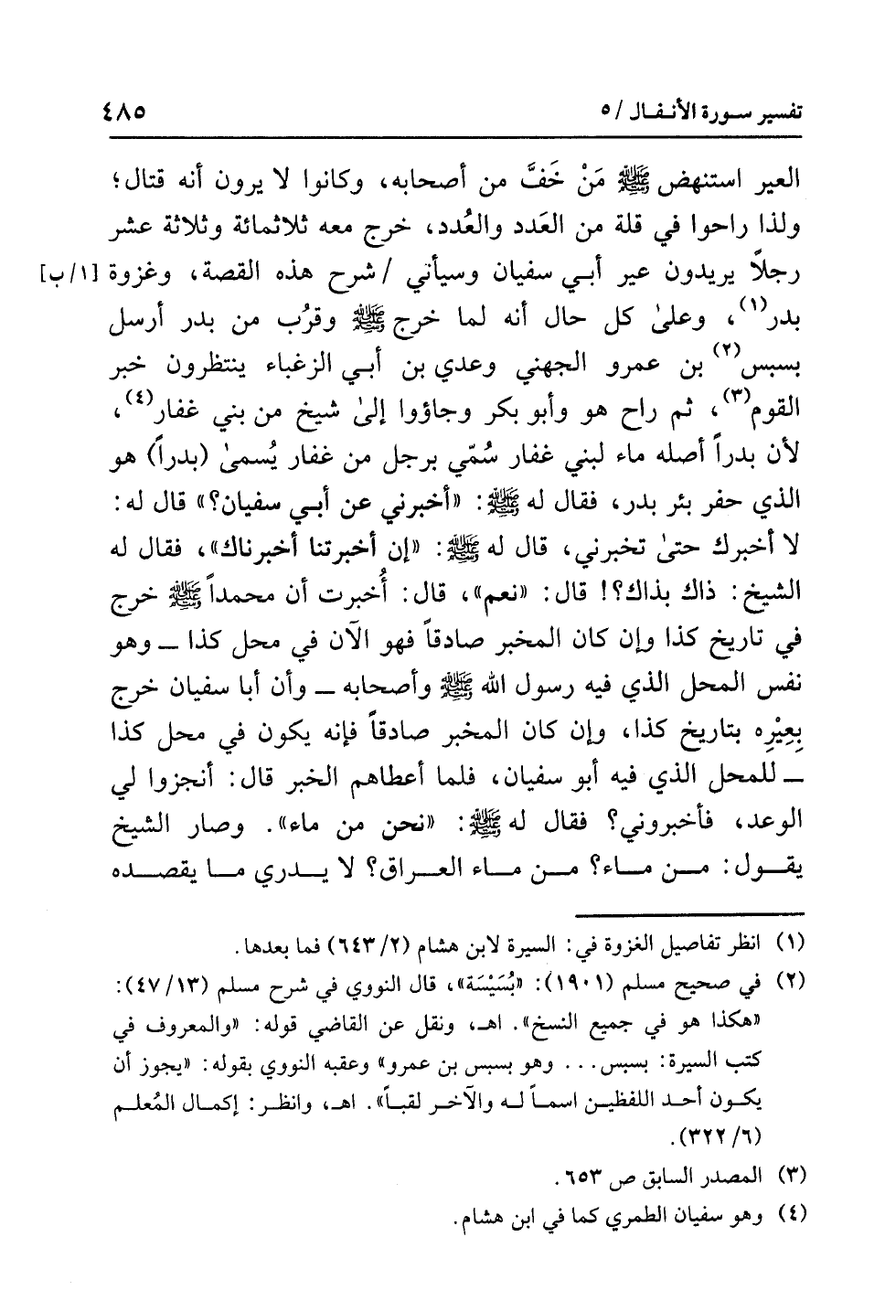 العير استنهض صلى الله عليه وسلم مَنْ خَفَّ من أصحابه، وكانوا لا يرون أنه قتال؛ ولذا راحوا في قلة من العَدد والعُدد، خرج معه ثلاثمائة وثلاثة عشر رجلاً يريدون عير أبي سفيان [1/ب] وسيأتي /شرح هذه القصة، وغزوة بدر (¬1)، وعلى كل حال أنه لما خرج صلى الله عليه وسلم وقرُب من بدر أرسل بسبس (¬2) بن عمرو الجهني وعدي بن أبي الزغباء ينتظرون خبر القوم (¬3)، ثم راح هو وأبو بكر وجاءوا إلى شيخ من بني غفار (¬4)؛