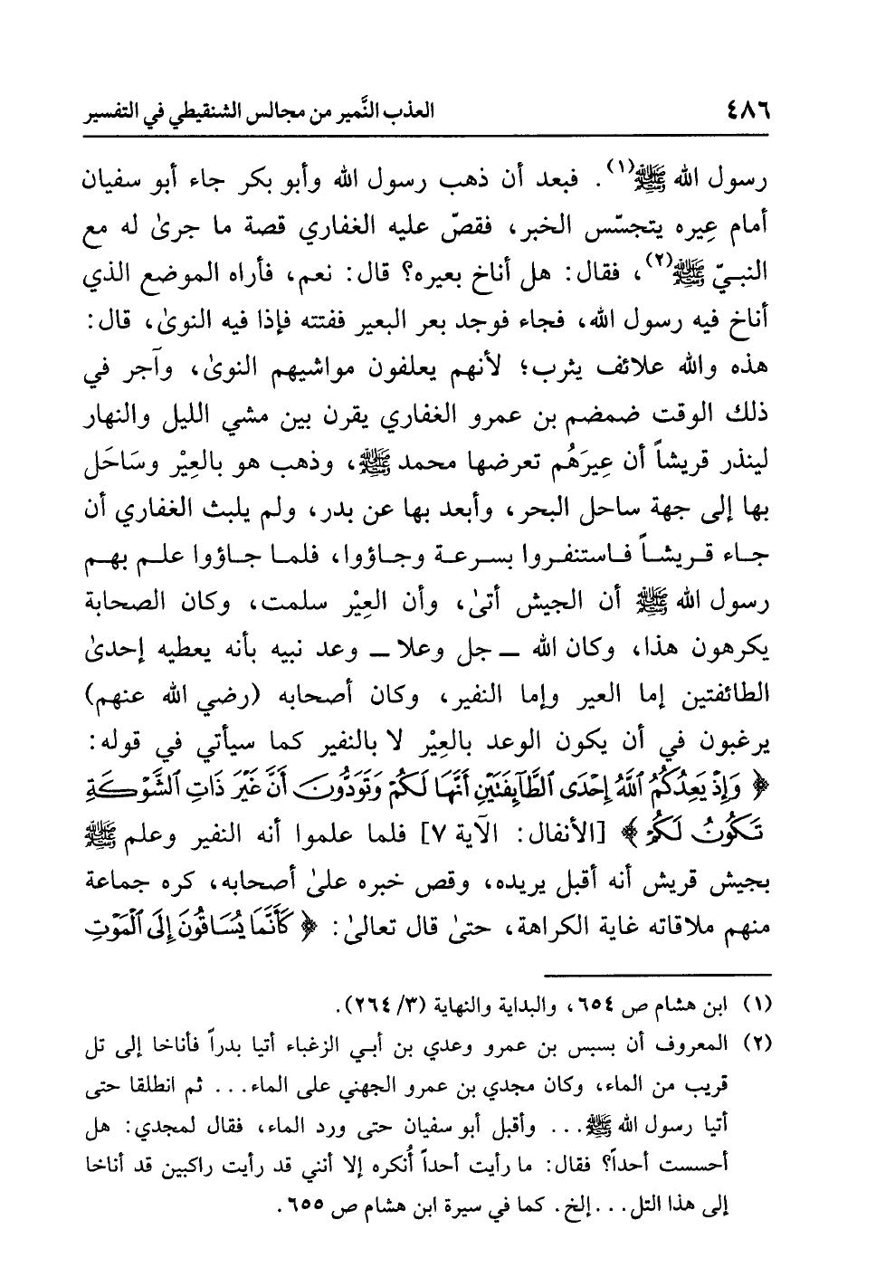 فقال: هل أناخ بعيره؟ قال: نعم، فأراه الموضع الذي أناخ فيه رسول الله، فجاء فوجد بعر البعير ففتته فإذا فيه النوى، قال: هذه والله علائف يثرب؛ لأنهم يعلفون مواشيهم النوى، وآجر في ذلك الوقت ضمضم بن عمرو الغفاري يقرن بين مشي الليل والنهار لينذر قريشًا أن عِيرَهُم تعرضها محمد صلى الله عليه وسلم، وذهب هو بالعِير وسَاحَل بها إلى جهة ساحل البحر، وأبعد بها عن بدر، ولم يلبث الغفاري أن جاء قريشًا فاستنفروا بسرعة وجاءوا، فلما جاءوا علم بهم رسول الله صلى الله عليه وسلم أن الجيش أتى، وأن العِير سلمت، وكان الصحابة يكرهون هذا، وكان الله -جل وعلا- وعد نبيه بأنه يعطيه إحدى الطائفتين إما العير وإما النفير، وكان أصحابه (رضي الله عنهم) يرغبون في أن يكون الوعد بالعِير لا بالنفير كما سيأتي في قوله: {وَإِذْ يَعِدُكُمُ اللَّهُ إِحْدَى الطَّائِفَتِيْنِ أَنَّهَا لَكُمْ وَتَوَدُّونَ أَنَّ غَيْرَ ذَاتِ الشَّوْكَةِ تَكُونُ لَكُمْ} [الأنفال: الآية 7] فلما علموا أنه النفير وعلم صلى الله عليه وسلم بجيش قريش أنه أقبل يريده، وقص خبره على أصحابه، كره جماعة منهم ملاقاته غاية الكراهة، حتى قال تعالى: {كَأَنَّمَا يُسَاقُونَ إِلَى الْمَوْتِ