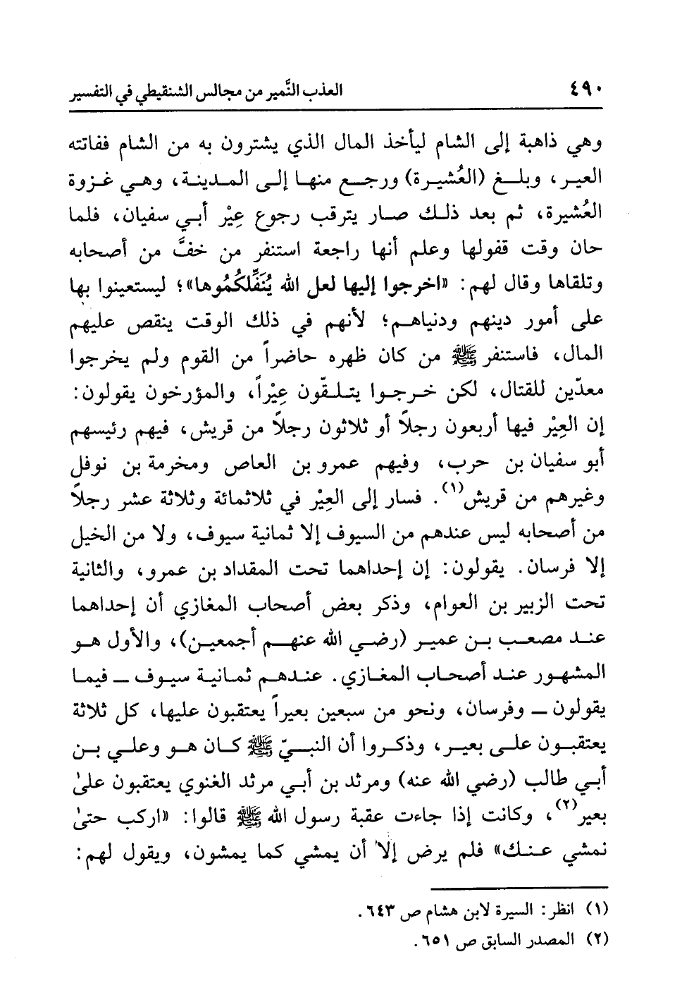 وهي ذاهبة إلى الشام ليأخذ المال الذي يشترون به مِنَ الشام ففاتته العير، وبلغ (العُشيرة) ورجع منها إلى المدينة، وهي غزوة العُشيرة، ثم بعد ذلك صار يترقب رجوع عِير أبي سفيان، فلما حان وقت قفولها وعلم أنها راجعة استنفر من خفَّ من أصحابه وتلقاها وقال لهم: «اخْرُجُوا إِلَيْهَا لَعَلَّ اللهَ يُنَفِّلكُمُوهَا»؛ ليستعينوا بها على أمور دينهم ودنياهم؛ لأنهم في ذلك الوقت ينقص عليهم المال، فاستنفر صلى الله عليه وسلم من كان ظهره حاضرًا من القوم ولم يخرجوا معدّين للقتال، لكن خرجوا يتلقّون عِيْرًا، والمؤرخون يقولون: إن العِير فيها أربعون رجلاً أو ثلاثون رجلاً من قريش، فيهم رئيسهم أبو سفيان بن حرب، وفيهم عمرو بن العاص، ومخرمة بن نوفل، وغيرهم من قريش (¬1). فسار إلى العِير في ثلاثماثة وثلاثة عشر رجلاً من أصحابه ليس عندهم من السيوف إلا ثمانية سيوف، ولا من الخيل إلا فرسان. يقولون: إن إحداهما تحت المقداد بن عمرو، والثانية تحت الزبير بن العوام، وذكر بعض أصحاب المغازي أن إحداهما عند مصعب بن عمير (رضي الله عنهم أجمعين)، والأول هو المشهور عند أصحاب المغازي. عندهم ثمانية سيوف -فيما يقولون- وفرسان، ونحو من سبعين بعيرًا يعتقبون عليها، كل ثلاثة يعتقبون على بعير، وذكروا أن النبي صلى الله عليه وسلم كان هو وعلي بن أبي طالب (رضي الله عنه) ومرثد بن أبي مرثد الغنوي يعتقبون على بعير (¬2)،