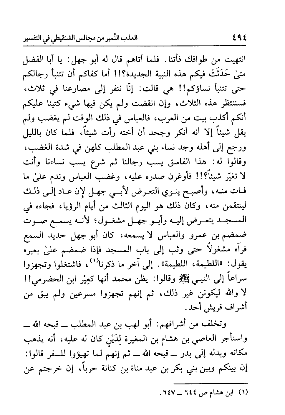 انتهيت من طوافك فأتنا. فلما أتاهم قال له أبو جهل: يا أبا الفضل متى حَدَثَتْ فيكم هذه النبية الجديدة؟! أما كفاكم أن تتنبأ رجالكم حتى تتنبأ نساؤكم! هي قالت: إنّا ننفر إلى مصارعنا في ثلاث، فسننتظر هذه الثلاث، وإن انقضت ولم يكن فيها شيء كتبنا عليكم أنكم أكذب بيت من العرب، فالعباس في ذلك الوقت لم يغضب ولم يقل شيئًا إلا أنه أنكر وجحد أن أخته رأت شيئًا، فلما كان بالليل ورجع إلى أهله وجد نساء بني عبد المطلب كلهن في شدة الغضب، وقلن له: هذا الفاسق يسب رجالنا ثم شرع يسب نساءنا وأنت لا تغيّر شيئًا؟! فأوغرن صدره عليه، وغضب العباس وندم على ما فات منه، وأصبح ينوي التعرض لأبي جهل لإن عاد إلى ذلك لينتقمن منه، وكان ذلك هو اليوم الثالث من أيام الرؤيا، فجاءه في المسجد يتعرض إليه وأبو جهل مشغول؛ لأنه يسمع صوت ضمضم بن عمرو والعباس لا يسمعه، كان أبو جهل حديد السمع، فرآه مشغولاً حتى وثب إلى باب المسجد فإذا ضمضم على بعيره يقول: «اللطيمة، اللطيمة». إلى آخر ما ذكرنا (¬1)،