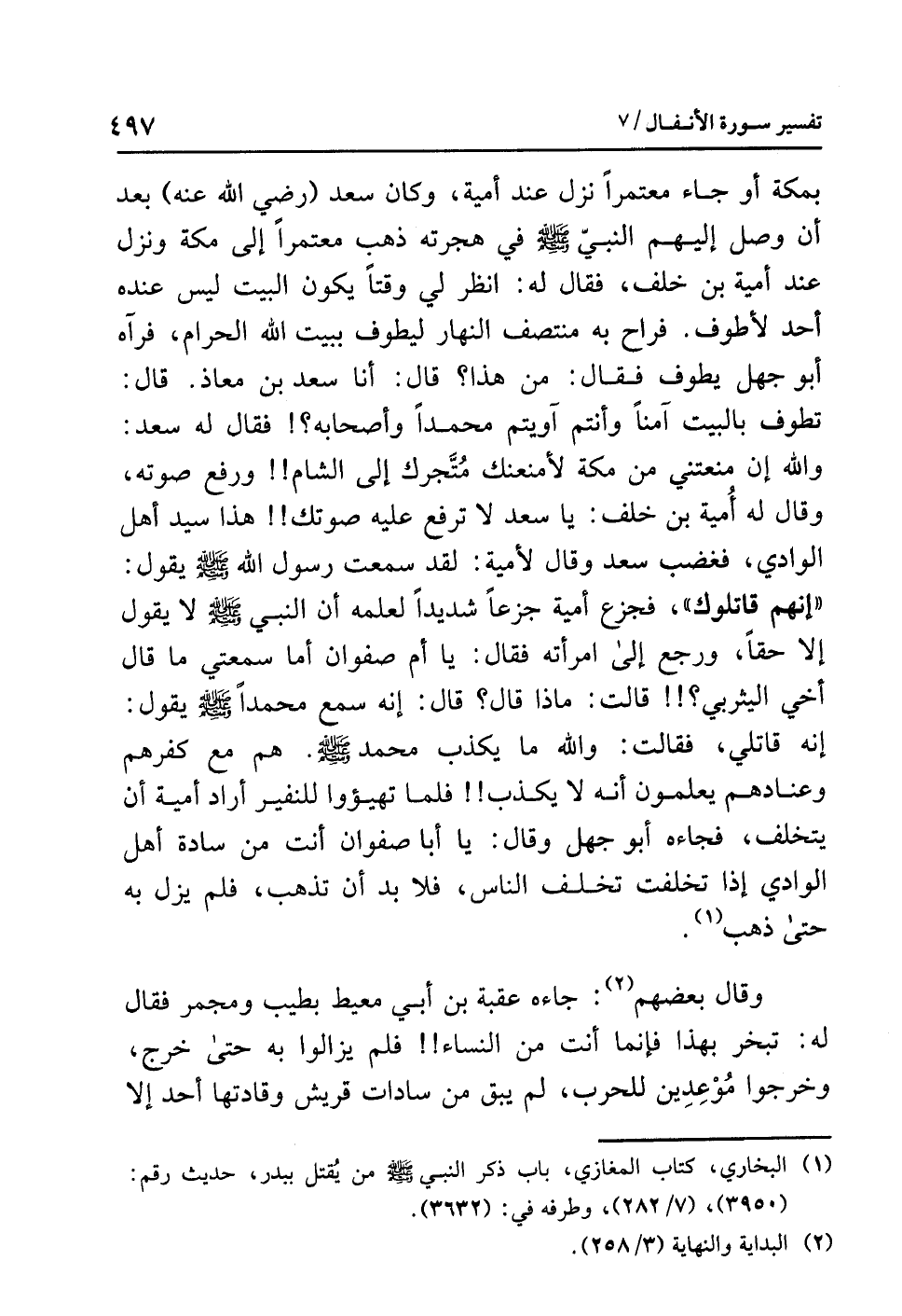 بمكة أو جاء معتمرًا نزل عند أمية، وكان سعد (رضي الله عنه) بعد أن وصل إليهم النبيّ صلى الله عليه وسلم في هجرته ذهب معتمرًا إلى مكة ونزل عند أمية بن خلف، فقال له: انظر لي وقتًا يكون البيت ليس عنده أحد لأطوف. فراح به منتصف النهار ليطوف ببيت الله الحرام، فرآه أبو جهل يطوف فقال: من هذا؟ قال: أنا سعد بن معاذ. قال: تطوف بالبيت آمنًا وأنتم آويتم محمدًا وأصحابه؟! فقال له سعد: والله إن منعتني من مكة لأمنعنك مُتَّجرك إلى الشام!! ورفع صوته، وقال له أُمية بن خلف: يا سعد لا ترفع عليه صوتك!! هذا سيد أهل الوادي، فغضب سعد وقال لأمية: لقد سمعت رسول صلى الله عليه وسلم يقول: «إنهُمْ قَاتِلُوكَ»، فجزع أمية جزعًا شديدًا لعلمه أن النبي صلى الله عليه وسلم لا يقول إلا حقًّا، ورجع إلى امرأته فقال: يا أم صفوان أما سمعتِ ما قال أخي اليثربي؟! قالت: ماذا قال؟ قال: إنه سمع محمدًا صلى الله عليه وسلم يقول: إنه قاتلي، فقالت: والله ما يكذب محمد صلى الله عليه وسلم. هم مع كفرهم وعنادهم يعلمون أنه لا يكذب!! فلما تهيؤوا للنفير أراد أمية أن يتخلَّف، فجاءه أبو جهل وقال: يا أبا صفوان أنت من سادة أهل الوادي إذا تخلفت تخلف الناس، فلا بد أن تذهب، فلم يزل به حتى ذهب (¬1).