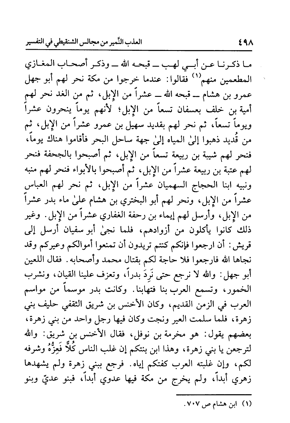 ما ذكرنا عن أبي لهب - قبحه الله - وذكر أصحاب المغازي المطعمين منهم (¬1) فقالوا: عندما خرجوا من مكة نحر لهم أبو جهل عمرو بن هشام -قبحه الله- عشرًا من الإبل، ثم من الغد نحر لهم أمية بن خلف بعسفان تسعًا من الإبل؛ لأنهم يومًا ينحرون عشرًا ويومًا تسعًا، ثم نحر لهم بقديد سهيل بن عمرو عشرًا من الإبل، ثم من قُديد ذهبوا إلى المياه إلى جهة ساحل البحر فأقاموا هناك يومًا، فنحر لهم شيبة بن ربيعة تسعًا من الإبل، ثم أصبحوا بالجحفة فنحر لهم عتبة بن ربيعة عشرًا من الإبل، ثم أصبحوا بالأبواء فنحر لهم منبه ونبيه ابنا الحجاج السهميان عشرًا من الإبل، ثم نحر لهم العباس عشرًا من الإبل، ونحر لهم أبو البختري بن هشام على ماء بدر عشرًا من الأبل، وأرسل لهم إيماء بن رحفة الغفاري عشرًا من الإبل. وغير ذلك كانوا يأكلون من أزوادهم، فلما نجى أبو سفيان أرسل إلى قريش: أن ارجعوا فإنكم كنتم تريدون أن تمنعوا أموالكم وعيركم وقد نجاها الله فارجعوا فلا حاجة لكم بقتال محمد وأصحابه. فقال اللعين أبو جهل: والله لا نرجع حتى نَرِدَ بدرًا، وتعزف علينا القيان، ونشرب الخمور، وتسمع العرب بنا فتهابنا. وكانت بدر موسمًا من مواسم العرب في الزمن القديم، وكان الأخنس بن شريق الثقفي حليف بني زهرة، فلما سلمت العير ونجت وكان فيها رجل واحد من بني زهرة، بعضهم يقول: هو مخرمة بن نوفل، فقال الأخنس بن شريق: والله لترجعن يا بني زهرة، وهذا ابن بنتكم إن غلب الناس كُلاً فَعِزُّهُ وشرفه لكم، وإن غلبته العرب كفتكم إياه. فرجع ببني زهرة ولم يشهدها زهري أبدًا، ولم يخرج من مكة فيها عدوي أبدًا، فبنو عديّ وبنو زهرة