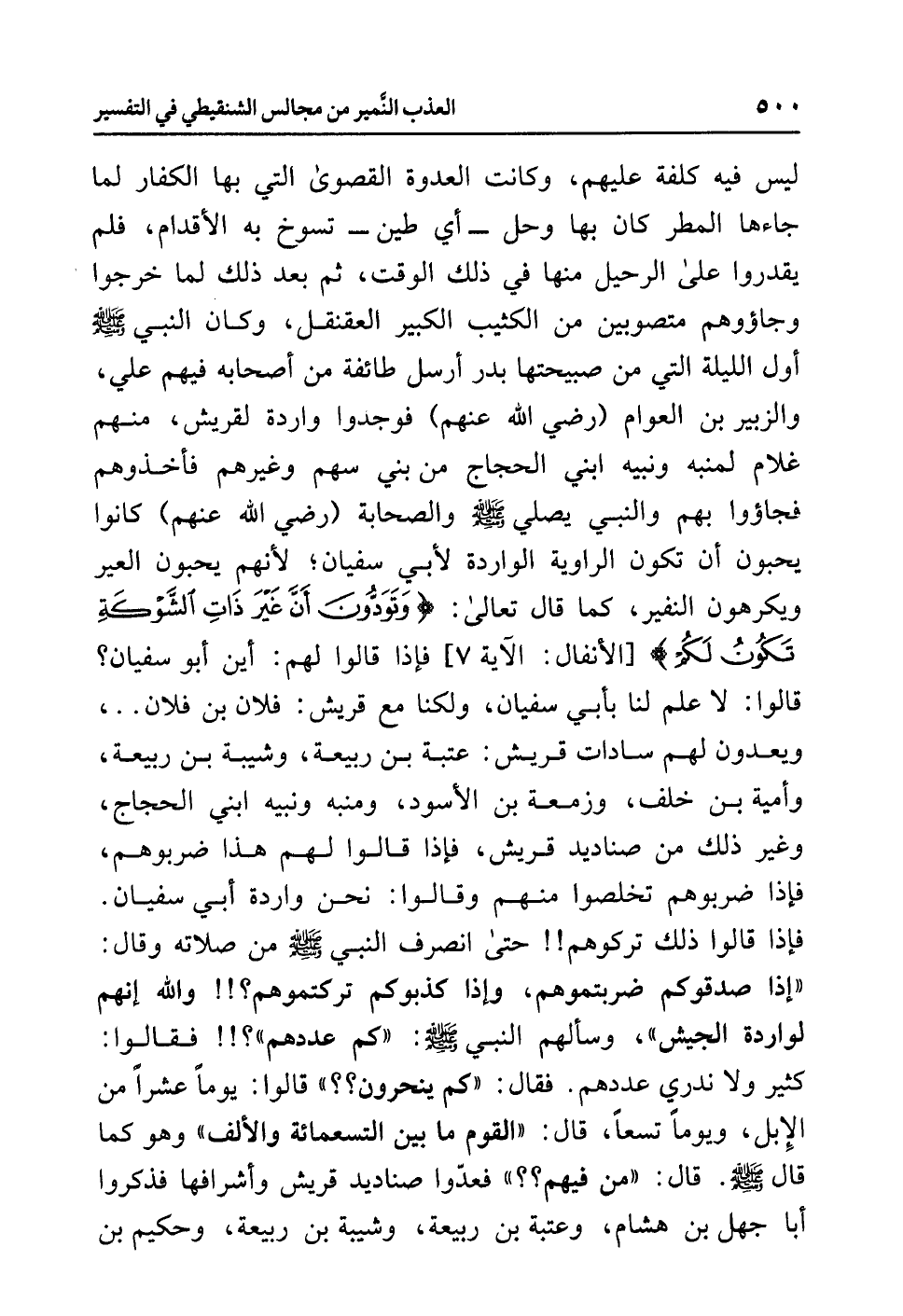 يحبون أن تكون الراوية الواردة لأبي سفيان؛ لأنهم يحبون العير ويكرهون النفير، كما قال تعالى: {وَتَوَدُّونَ أَنَّ غَيْرَ ذَاتِ الشَّوْكَةِ تَكُونُ لَكُمْ} [الأنفال: الآية 7] فإذا قالوا لهم: أين أبو سفيان؟ قالوا: لا علم لنا بأبي سفيان، ولكنا مع قريش: فلان بن فلان .. ، ويعدّون لهم سادات قريش: عتبة بن ربيعة، وشيبة بن ربيعة، وأمية بن خلف، وزمعة بن الأسود، ومنبه ونبيه ابني الحجاج، وغير ذلك من صناديد قريش، فإذا قالوا لهم هذا ضربوهم، فإذا ضربوهم تخلصوا منهم وقالوا: نحن واردة أبي سفيان. فإذا قالوا ذلك تركوهم! حتى انصرف النبي صلى الله عليه وسلم من صلاته وقال: «إذَا صَدَقُوكُمْ ضَرَبْتُمُوهُمْ، وإذا كَذَبُوكُمْ تَرَكْتُمُوهُمْ؟! واللهِ إنَّهُمْ لَوَارِدَةُ الجَيْشِ»، وسألهم النبي صلى الله عليه وسلم: «كم عددهُم»؟! فقالوا: كثير ولا ندري عددهم. فقال: «كم يَنْحَرُون؟» قالوا: يومًا عشرًا من الإبل، ويومًا تسعًا، قال: «القَوْمُ ما بين التِّسْعِمِائَةِ والأَلْفِ» وهو كما قال صلى الله عليه وسلم. قال: «مَنْ فِيهم؟» فعدّوا صناديد قريش وأشرافها فذكروا أبا جهل بن هشام، وعتبة بن ربيعة، وشيبة بن ربيعة، وحكيم بن