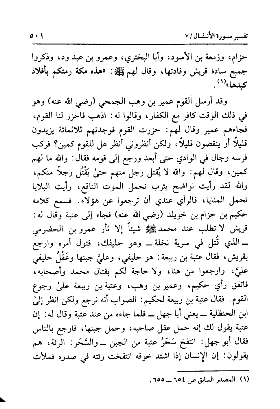 وقد أرسل القوم عمير بن وهب الجمحي (رضي الله عنه) وهو في ذلك الوقت كافر مع الكفار، وقالوا له: اذهب فاحزر لنا القوم، فجاءهم عمير وقال لهم: حزرت القوم فوجدتهم ثلاثمائة يزيدون قليلاً أو ينقصون قليلاً، ولكن أنظروني أنظر هل للقوم كمين؟ فركب فرسه وجال في الوادي حتى أبعد ورجع إلى قومه فقال: والله ما لهم كمين، وقال لهم: والله لا يُقتل رجل منهم حتى يَقْتُل رجلاً منكم، والله لقد رأيت نواضح يثرب تحمل الموت الناقع، رأيت البلايا تحمل المنايا، فالرأي عندي أن ترجعوا عن هؤلاء. فسمع كلامه حكيم بن حزام بن خويلد (رضي الله عنه) فجاء إلى عتبة وقال له: قريش لا تطلب عند محمد صلى الله عليه وسلم شيئًا إلا ثأر عمرو بن الحضرمي -الذي قُتل في سرية نخلة- وهو حليفك، فتول أمره وارجع بقريش، فقال عتبة بن ربيعة: هو حليفي، وعليَّ جبنها وعَقْلُ حليفي عليَّ، وارجعوا من هنا، ولا حاجة لكم بقتال محمد وأصحابه، فاتفق رأي حكيم، وعمير بن وهب، وعتبة بن ربيعة على رجوع القوم. فقال عتبة بن ربيعة لحكيم: الصواب أنه نرجع ولكن انظر إلى ابن الحنظلية -يعني أبا جهل- فلما جاءه من عند عتبة وقال له: إن عتبة يقول لك إنه حمل عقل صاحبه، وحمل جبنها، فارجع بالناس فقال أبو جهل: انتفخ سَحَرُ عتبة من الجبن -والسَّحَر: الرئة، هم يقولون: إن الإنسان إذا اشتد خوفه انتفخت رئته في صدره فملأت