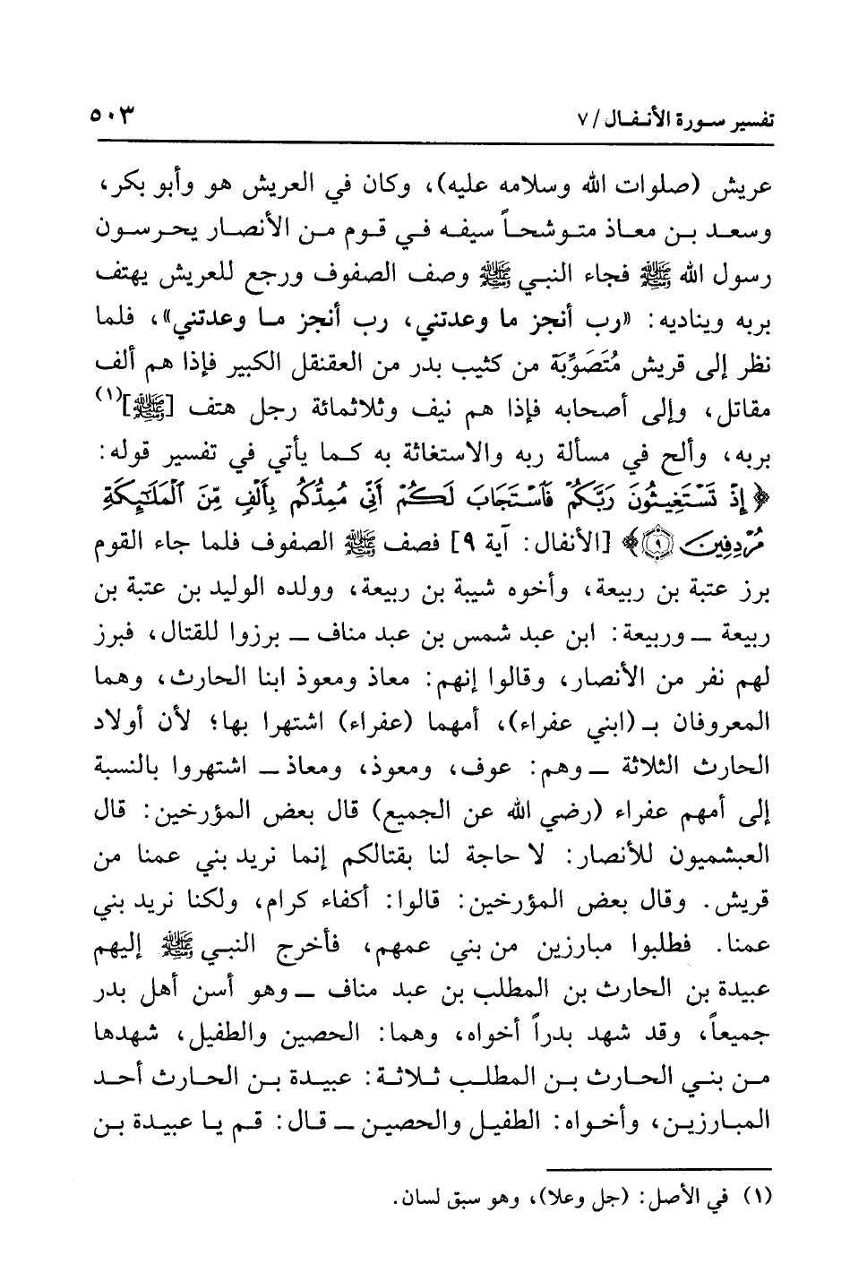 عريش (صلوات الله وسلامه عليه)، وكان في العريش هو وأبو بكر، وسعد بن معاذ متوشحًا سيفه في قوم من الأنصار يحرسون رسول الله صلى الله عليه وسلم فجاء النبي صلى الله عليه وسلم وصف الصفوف ورجع للعريش يهتف بربه ويناديه: «رَبِّ أَنْجِزْ مَا وَعَدْتَنِي، رَبِّ أَنْجِزْ مَا وَعَدْتَنِي»، فلما نظر إلى قريش مُتَصَوِّبَة من كثيب بدر من العقنقل الكبير فإذا هم ألف مقاتل، وإلى أصحابه فإذا هم نيف وثلاثمائة رجل هتف [صلى الله عليه وسلم] (¬1) بربه، وألح في مسألة رَبِّهِ والاستغاثة به كما يأتي في تفسير قوله: {إِذْ تَسْتَغِيثُونَ رَبَّكُمْ فَاسْتَجَابَ لَكُمْ أَنِّي مُمِدُّكُم بِأَلْفٍ مِّنَ الْمَلآئِكَةِ مُرْدِفِينَ (9)} [الأنفال: آية 9] فصف صلى الله عليه وسلم الصفوف فلما جاء القوم برز عتبة بن ربيعة، وأخوه شيبة بن ربيعة، وولده الوليد بن عتبة بن ربيعة -وربيعة: ابن عبد شمس بن عبد مناف- برزوا للقتال، فبرز لهم نفر من الأنصار، وقالوا إنهم: معاذ ومعوذ ابنا الحارث، وهما المعروفان بـ (ابني عفراء)، أمهما (عفراء) اشتهرا بها؛ لأن أولاد الحارث الثلاثة -وهم: عوف، ومعوذ، ومعاذ- اشتهروا بالنسبة إلى أمهم عفراء (رضي الله عن الجميع) قال بعض المؤرخين: قال العبشميون للأنصار: لا حاجة لنا بقتالكم إنما نريد بَنِي عَمِّنَا مِنْ قريش. وقال بعض المؤرخين: قالوا: أكفاء كرام، ولكنا نريد بني عمنا. فطلبوا مبارزين من بني عمهم، فأخرج النبي صلى الله عليه وسلم إليهم عبيدة بن الحارث بن المطلب بن عبد مناف -وهو أسن أهل بدر جميعًا، وقد شهد بدرًا أخواه، وهما: الحصين والطفيل، شهدها من بني الحارث بن المطلب ثلاثة: عبيدة بن الحارث أحد المبارزين، وأخواه: الطفيل والحصين- قال: قم يا عبيدة بن
