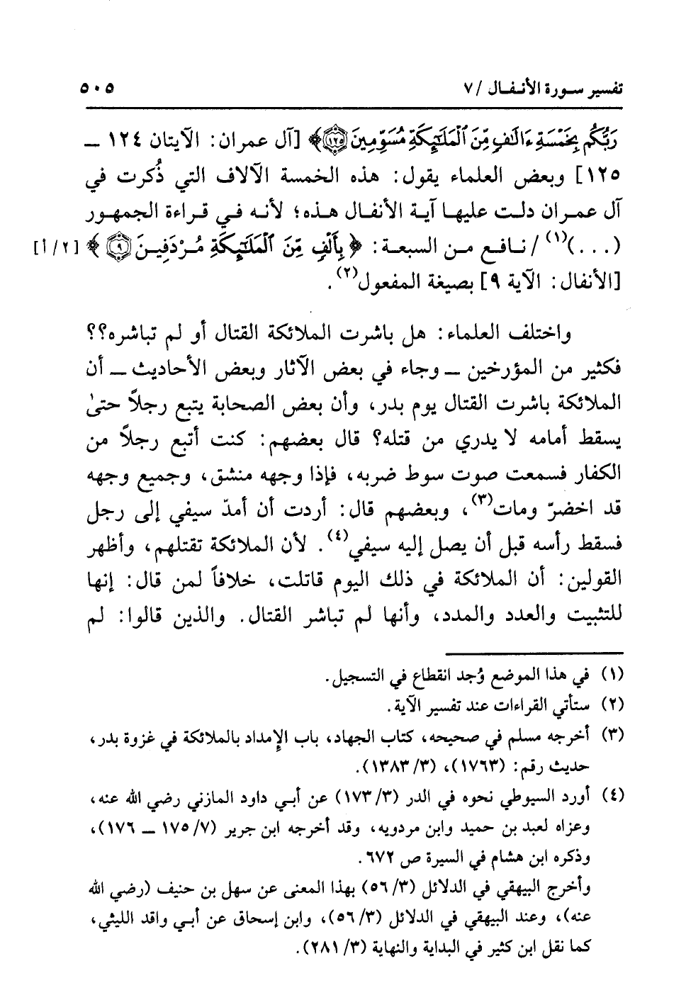 واختلف العلماء: هل باشرت الملائكة القتال أو لم تباشره؟ فكثير من المؤرخين -وقد جاء في بعض الآثار وبعض الأحاديث- أن الملائكة باشرت القتال يوم بدر، وأن بعض الصحابة يتبع رجلاً حتى يسقط أمامه لا يدري مَنْ قَتَلَهُ؟ قال بعضهم: كنت أتبع رجلاً من الكفار فسمعت صوت سوط ضربه، فإذا وجهه منشق، وجميع وجهه قد اخضرّ ومات (¬3)، وبعضهم قال: أردت أن أمدّ سيفي إلى رجل فسقط رأسه قبل أن يصل إليه سيفي (¬4). لأن الملائكة تقتلهم، وأظهر القولين: أن الملائكة في ذلك اليوم قاتلت، خلافًا لمن قال: إنها للتثبيت والعدد والمدد، وأنها لم تباشر القتال. والذين قالوا: لم