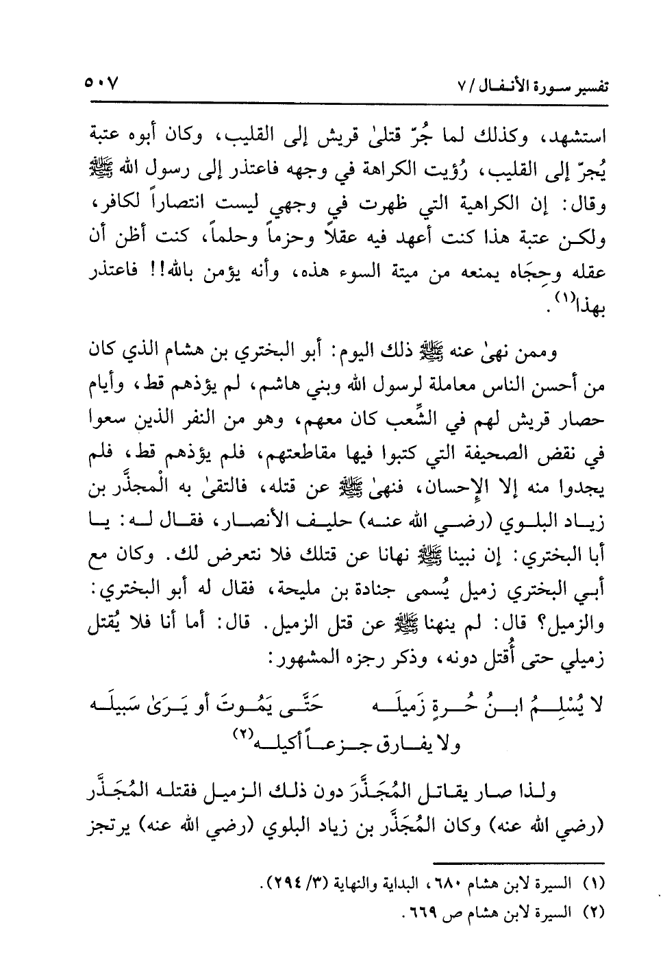 استشهد، وكذلك لما جُرّ قتلى قريش إلى القليب، وكان أبوه عتبة يُجرّ إلى القليب، رُؤيت الكراهة في وجهه فاعتذر إلى رسول الله صلى الله عليه وسلم وقال: إن الكراهية التي ظهرت في وجهي ليست انتصارًا لكافر، ولكن عتبة هذا كنت أعهد فيه عقلاً وحزمًا وحلمًا، كنت أظن أن عقله وحِجَاه يمنعه من ميتة السوء هذه، وأنه يؤمن بالله!! فاعتذر بهذا (¬1).