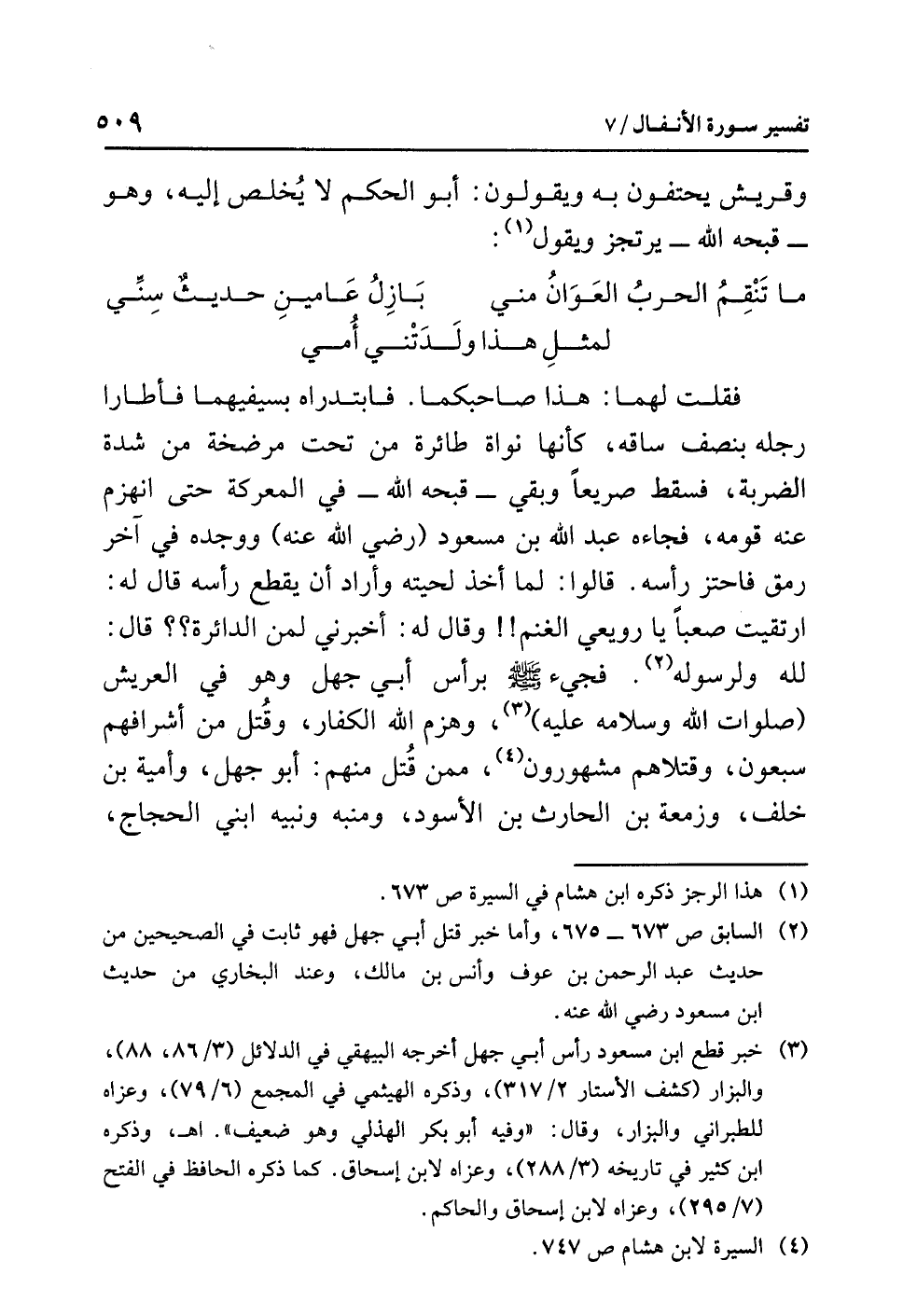(¬3) خبر قطع ابن مسعود رأس أبي جهل أخرجه البيهقي في الدلائل (3/ 86، 88)، والبزار (كشف الأستار) (2/ 317) وذكره الهيثمي في المجمع (6/ 79) وعزاه للطبراني والبزار، وقال: «وفيه أبو بكر الهذلي وهو ضعيف» اهـ. وذكره ابن كثير في تاريخه (3/ 288) وعزاه لابن إسحاق. كما ذكره الحافظ في الفتح (7/ 295) وعزاه لابن إسحاق والحاكم.