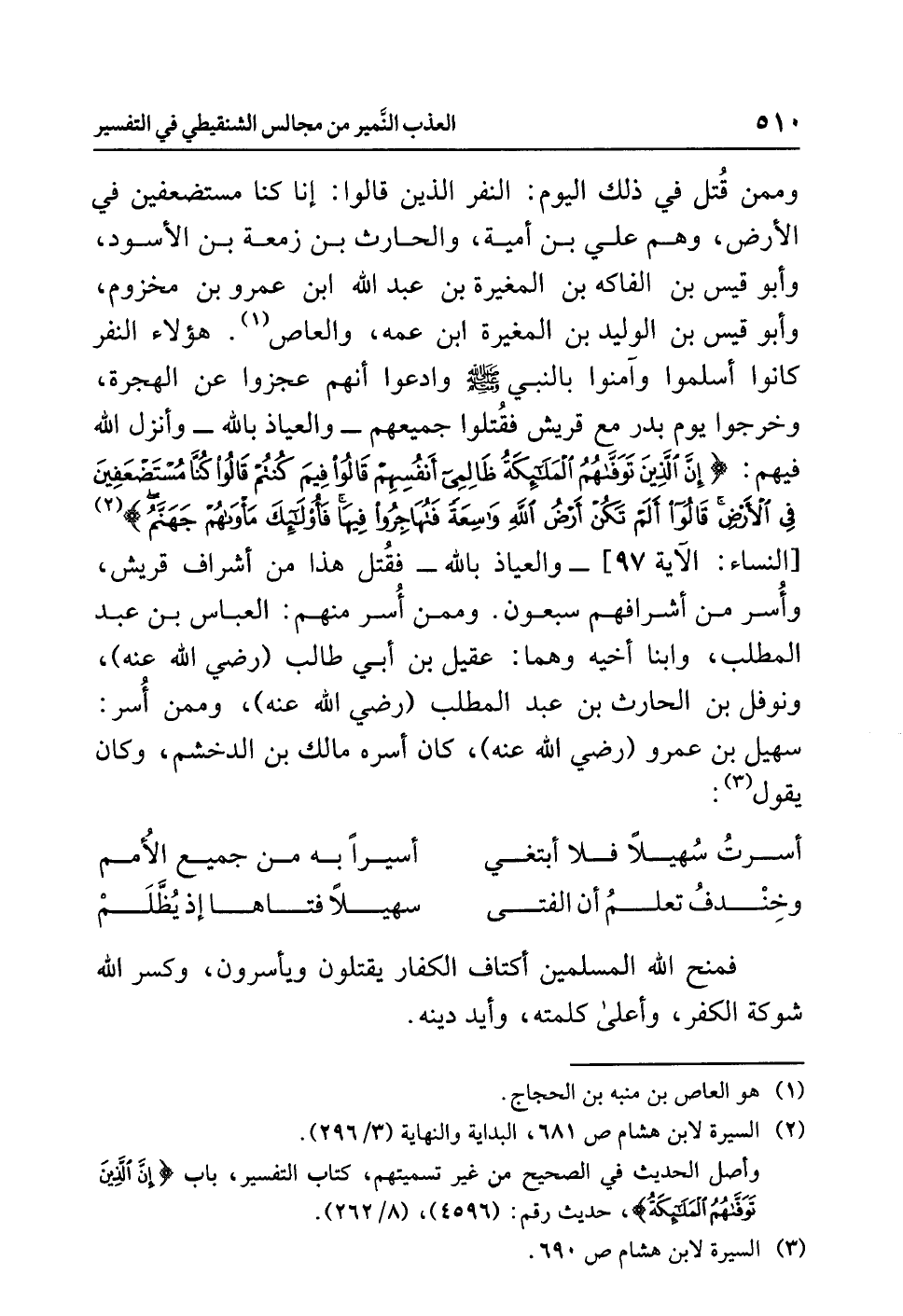 هؤلاء النفر كانوا أسلموا وآمنوا بالنبي صلى الله عليه وسلم وادعوا أنهم عجزوا عن الهجرة، وخرجوا يوم بدر مع قريش فقُتلوا جميعهم -والعياذ بالله- وأنزل الله فيهم: {إِنَّ الَّذِينَ تَوَفَّاهُمُ الْمَلآئِكَةُ ظَالِمِي أَنْفُسِهِمْ قَالُواْ فِيمَ كُنتُمْ قَالُواْ كُنَّا مُسْتَضْعَفِينَ فِي الأَرْضِ قَالُواْ أَلَمْ تَكُنْ أَرْضُ اللَّهِ وَاسِعَةً فَتُهَاجِرُواْ فِيهَا فَأُوْلَئِكَ مَأْوَاهُمْ جَهَنَّمُ} (¬2) [النساء: الآية 97]- والعياذ بالله - فقُتل هذا من أشراف قريش، وأُسر من أشرافهم سبعون. وممن أُسر منهم: العباس بن عبد المطلب، وابنا أخيه وهما: عقيل بن أبي طالب (رضي الله عنه) ونوفل بن الحارث بن عبد المطلب (رضي الله عنه)، وممن أُسر: سهيل بن عمرو (رضي الله عنه) كان أسره مالك بن الدخشم، وكان يقول (¬3):