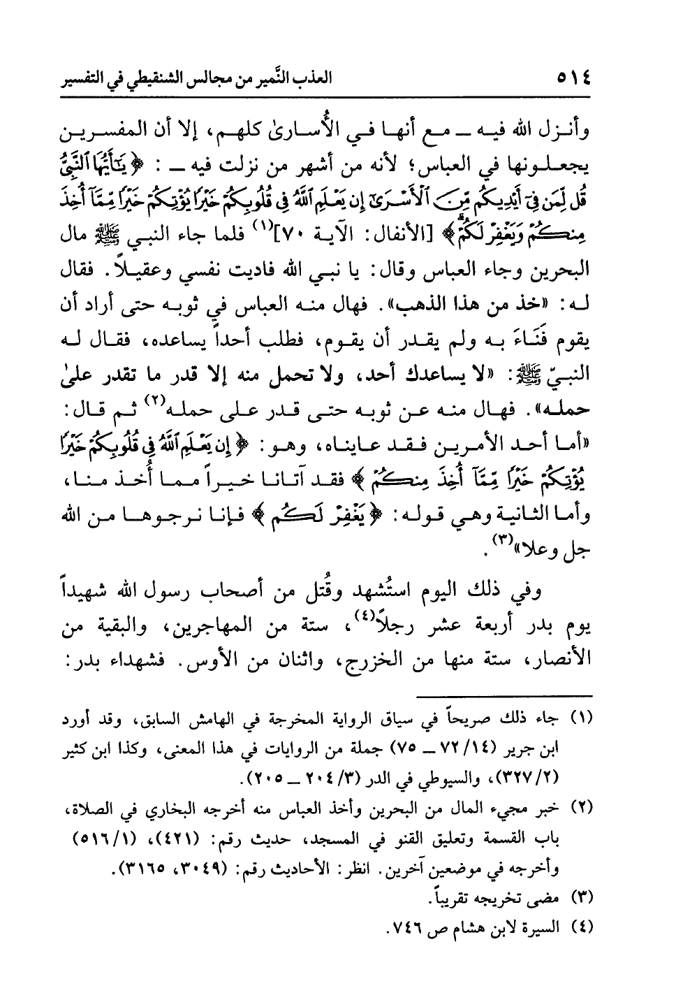 وأنزل الله فيه -مع أنها في الأُسارى كلهم، إلا أن المفسرين يجعلونها في العباس؛ لأنه من أشهر من نزلت فيه-: {يَا أَيُّهَا النَّبِيُّ قُل لِّمَن فِي أَيْدِيكُم مِّنَ الأَسْرَى إِن يَعْلَمِ اللَّهُ فِي قُلُوبِكُمْ خَيْرًا يُؤْتِكُمْ خَيْرًا مِّمَّا أُخِذَ مِنكُمْ وَيَغْفِرْ لَكُمْ} [الأنفال: الآية 70] (¬1) فلما جاء النبي صلى الله عليه وسلم مال البحرين وجاء العباس وقال: يا نبي الله فاديت نفسي وعقيلاً. فقال له: «خُذْ مِنْ هَذَا الذَّهَبِ». فهال منه العباس في ثوبه حتى أراد أن يقوم فَنَاءَ به ولم يقدر أن يقوم، فطلب أحدًا يساعده، فقال له النبيّ صلى الله عليه وسلم: «لاَ يُسَاعِدُكَ أَحَدٌ، وَلاَ تَحْمِلْ مِنْهُ إِلاَّ قَدْرَ مَا تَقْدِرُ عَلَى حَمْلِهِ». فهال منه عن ثوبه حتى قدر على حمله (¬2)