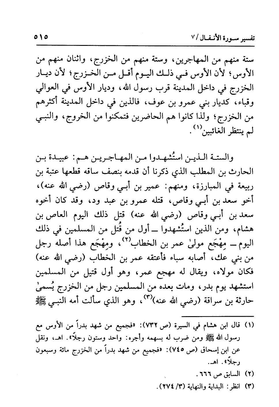 (¬1) قال ابن هشام في السيرة (ص732): «فجميع من شهد بدرًا من الأوس مع رسول الله صلى الله عليه وسلم ومن ضرب له بسهمه وأجره: واحد وستون رجلاً» اهـ. ونقل عن ابن إسحاق (ص745): «فجميع من شهد بدرًا من الخزرج مائة وسبعون رجلاً» اهـ.