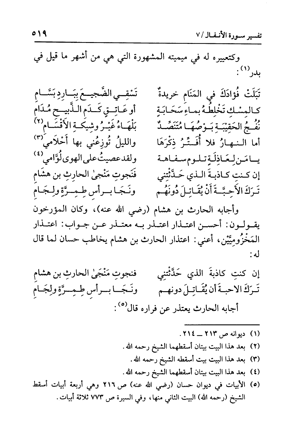 (¬5) الأبيات في ديوان حسان (رضي الله عنه) ص216 وهي أربعة أبيات أسقط الشيخ (رحمه الله) البيت الثاني منها. وفي السيرة ص773 ثلاثة أبيات.