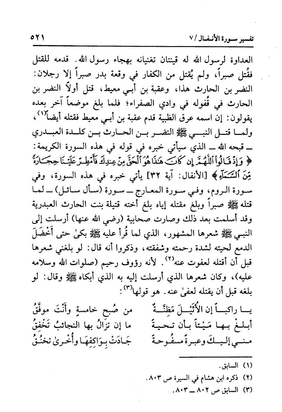 العداوة لرسول الله، له قينتان تغنيانه بهجاء رسول الله- قدمه للقتل فقُتِلَ صَبْرًا، ولم يُقتل من الكفار في وقعة بدر صبرًا إلا رجلان: النضر بن الحارث هذا، وعقبة بن أبي معيط، قتل أولاً النضر بن الحارث في قُفوله في وادي الصفراء؛ فلما بلغ موضعًا آخر بعده يقولون: إن اسمه عرق الظبية قدم عقبة بن أبي معيط فقتله أيضًا (¬1)، ولما قَتَلَ النبيُّ صلى الله عليه وسلم النَّضْرَ بن الحارث بن كلدة العبدري -قبحه الله- الذي سيأتي خبره في قوله في هذه السورة الكريمة: {وَإِذْ قَالُواْ اللَّهُمَّ إِن كَانَ هَذَا هُوَ الْحَقَّ مِنْ عِندِكَ فَأَمْطِرْ عَلَيْنَا حِجَارَةً مِّنَ السَّمَاءِ} [الانفال: آية 32] يأتي خبره في هذه السورة، وفي سورة الروم، وفي سورة المعارج -سورة (سأل سائل) - لما قتله صلى الله عليه وسلم صبرًا وبلغ مقتله إياه بلغ أخته قتيلة بنت الحارث العَبْدَرِيَّة وقد أسلمت بعد ذلك وصارت صحابية (رضي الله عنها) أرسلت إلى النبي صلى الله عليه وسلم شعرها المشهور، الذي لما قُرئ عليه صلى الله عليه وسلم بكى حتى أَخْضَلَ الدمع لحيته لشدة رحمته وشفقته، وذكروا أنه قال: لو بلغني شعرها قبل أن أقتله لعفوت عنه (¬2).