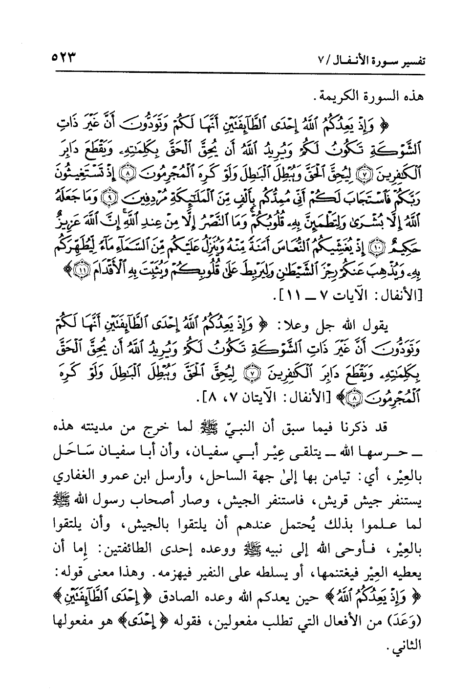 قال الله تعالى: {وَإِذْ يَعِدُكُمُ اللَّهُ إِحْدَى الطَّائِفَتِيْنِ أَنَّهَا لَكُمْ وَتَوَدُّونَ أَنَّ غَيْرَ ذَاتِ الشَّوْكَةِ تَكُونُ لَكُمْ وَيُرِيدُ اللَّهُ أَن يُحِقَّ الحَقَّ بِكَلِمَاتِهِ وَيَقْطَعَ دَابِرَ الْكَافِرِينَ (7) لِيُحِقَّ الْحَقَّ وَيُبْطِلَ الْبَاطِلَ وَلَوْ كَرِهَ الْمُجْرِمُونَ (8) إِذْ تَسْتَغِيثُونَ رَبَّكُمْ فَاسْتَجَابَ لَكُمْ أَنِّي مُمِدُّكُم بِأَلْفٍ مِّنَ الْمَلآئِكَةِ مُرْدِفِينَ (9) وَمَا جَعَلَهُ اللَّهُ إِلاَّ بُشْرَى وَلِتَطْمَئِنَّ بِهِ قُلُوبُكُمْ وَمَا النَّصْرُ إِلاَّ مِنْ عِندِ اللَّهِ إِنَّ اللَّهَ عَزِيزٌ حَكِيمٌ (10) إِذْ يُغَشِّيكُمُ النُّعَاسَ أَمَنَةً مِّنْهُ وَيُنَزِّلُ عَلَيْكُم مِّنَ السَّمَاءِ مَاءً لِّيُطَهِّرَكُم بِهِ وَيُذْهِبَ عَنكُمْ رِجْزَ الشَّيْطَانِ وَلِيَرْبِطَ عَلَى قُلُوبِكُمْ وَيُثَبِّتَ بِهِ الأَقْدَامَ (11)} [الأنفال: الآيات 7 - 11].