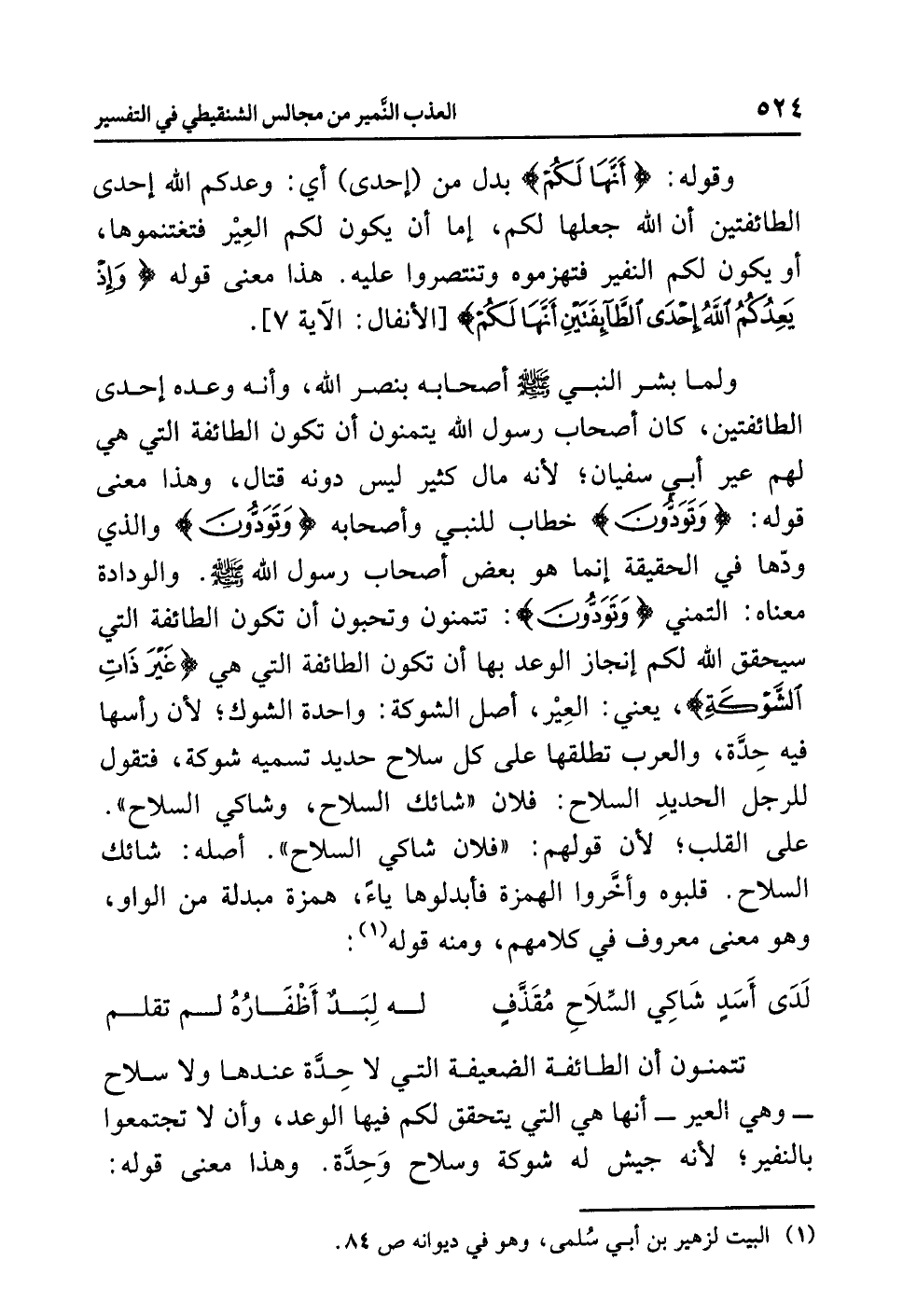 ولما بشر النبي صلى الله عليه وسلم أصحابه بنصر الله، وأنه وعده إحدى الطائفتين، كان أصحاب رسول الله يتمنَّوْنَ أن تكون الطائفة التي هي لهم عير أبي سفيان؛ لأنه مالٌ كَثِيرٌ ليس دونه قتال، وهذا معنى قوله: {وَتَوَدُّونَ} خطاب للنبي وأصحابه {وَتَوَدُّونَ} والذي ودّها في الحقيقة إنما هو بعض أصحاب رسول الله صلى الله عليه وسلم. والودادة معناه: التمني {وَتَوَدُّونَ}: تتمنون وتحبون أن تكون الطائفة التي سيحقق الله لكم إنجاز الوعد بها أن تكون الطائفة التي هي {غَيْرَ ذَاتِ الشَّوْكَةِ}، يعني: العِير، أصل الشوكة: واحدة الشوك؛ لأن رأسها فيه حِدَّة، والعرب تطلقها على كل سلاح حديد تسميه (شوكة)، فتقول للرجل الحديدِ السلاح: «فلان شائك السلاح، وشاكي السلاح». على القلب؛ لأن قولهم: «فلان شاكي السلاح». أصله: شائك السلاح. قلبوه وأخَّروا الهمزة فابدلوها ياءً، همزة مبدلة من الواو، وهو معنى معروف في كلامهم، ومنه قوله (¬1):