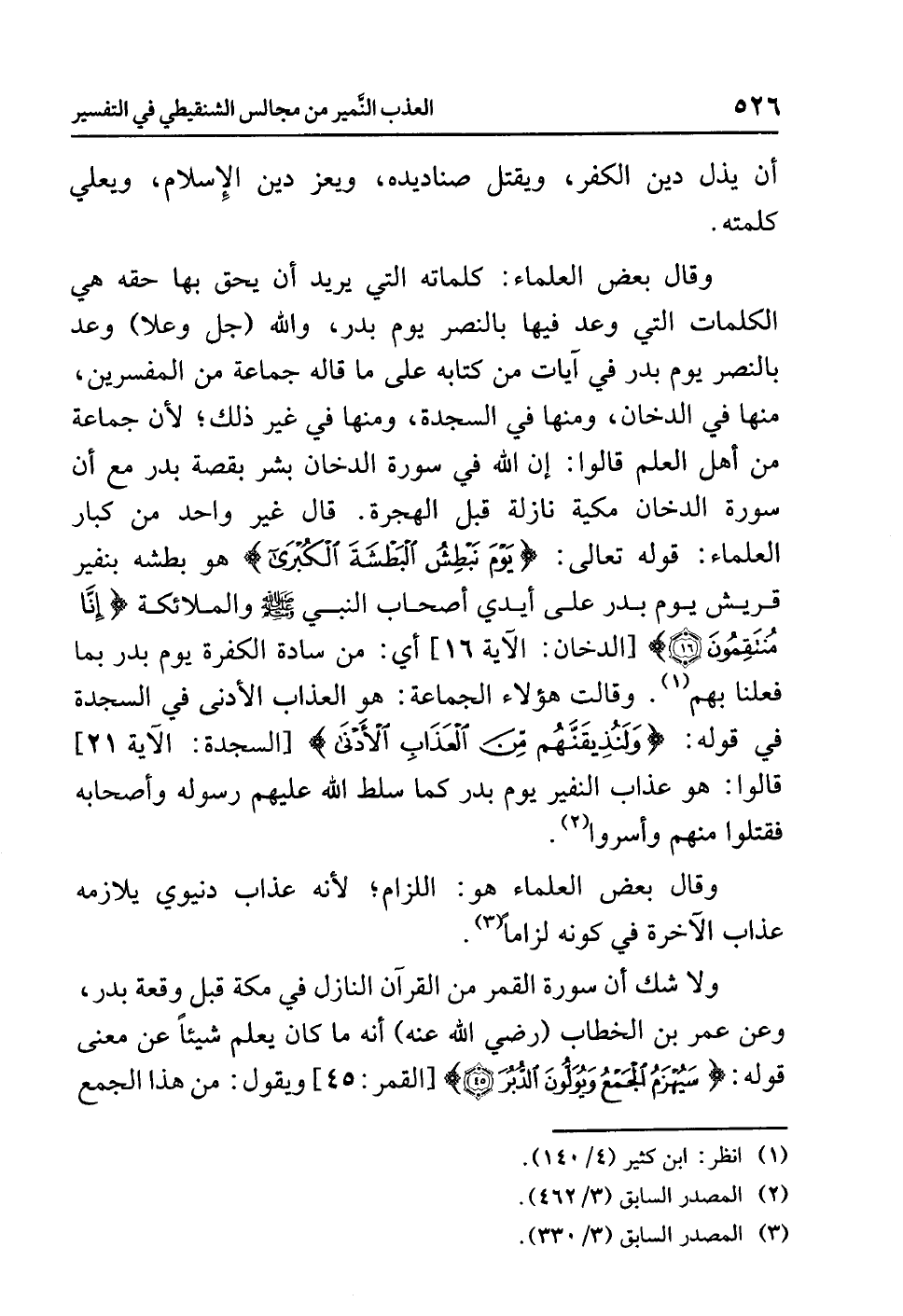 وقال بعض العلماء: كلماته التي يريد أن يحق بها حقه هي الكلمات التي وعد فيها بالنصر يوم بدر، والله (جل وعلا) وعد بالنصر يوم بدر في آيات من كتابه على ما قاله جماعة من المفسرين، منها في الدخان، ومنها في السجدة، ومنها في غير ذلك؛ لأن جماعة من أهل العلم قالوا: إن الله في سورة الدخان بشر بقصة بدر مع أن سورة الدخان مكية نازلة قبل الهجرة. قال غير واحد من كبار العلماء: قوله تعالى: {يَوْمَ نَبْطِشُ الْبَطْشَةَ الْكُبْرَى} هو بطشه بنفير قريش يوم بدر على أيدي أصحاب النبي صلى الله عليه وسلم والملائكة {إِنَّا مُنتَقِمُونَ} [الدخان: الآية 16] أي: من سادة الكفرة يوم بدر بما فعلنا بهم (¬1). وقالت هؤلاء الجماعة: هو العذاب الأدنى في السجدة في قوله: {وَلَنُذِيقَنَّهُم مِّنَ الْعَذَابِ الأَدْنَى} [السجدة: الآية 21] قالوا: هو عذاب النفير يوم بدر كما سلط الله عليهم رسوله وأصحابه فقتلوا منهم وأسروا (¬2).