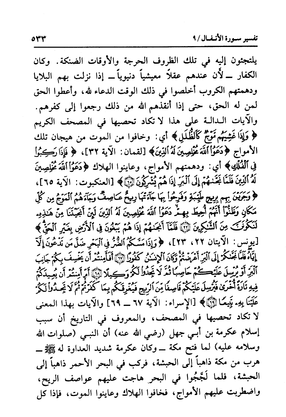 والآيات الدالة على هذا لا تكاد تحصيها في المصحف الكريم {وَإِذَا غَشِيَهُم مَّوْجٌ كَالظُّلَلِ} أي: وخافوا من الموت من هيجان تلك الأمواج {دَعَوُا اللَّهَ مُخْلِصِينَ لَهُ الدِّينَ} [لقمان: الآية 32] {فَإِذَا رَكِبُوا فِي الْفُلْكِ} أي: ودهمتهم الأمواج، وعاينوا الهلاك {دَعَوُا اللَّهَ مُخْلِصِينَ لَهُ الدِّينَ فَلَمَّا نَجَّاهُمْ إِلَى الْبَرِّ إِذَا هُمْ يُشْرِكُونَ} [العنكبوت: الآية 65] {وَجَرَيْنَ بِهِم بِرِيحٍ طَيِّبَةٍ وَفَرِحُواْ بِهَا جَاءَتْهَا رِيحٌ عَاصِفٌ وَجَاءَهُمُ الْمَوْجُ مِن كُلِّ مَكَانٍ وَظَنُّواْ أَنَّهُمْ أُحِيطَ بِهِمْ دَعَوُا اللَّهَ مُخْلِصِينَ لَهُ الدِّينَ لَئِنْ أَنجَيْتَنَا مِنْ هَذِهِ لَنَكُونَنَّ مِنَ الشَّاكِرِينَ (22) فَلَمَّا أَنجَاهُمْ إِذَا هُمْ يَبْغُونَ فِي الأَرْضِ بِغَيْرِ الْحَقِّ} [يونس: الآيتان 22، 23] {وَإِذَا مَسَّكُمُ الْضُّرُّ فِي الْبَحْرِ ضَلَّ مَن تَدْعُونَ إِلاَّ إِيَّاهُ فَلَمَّا نَجَّاكُمْ إِلَى الْبَرِّ أَعْرَضْتُمْ وَكَانَ الإِنْسَانُ كَفُورًا (67) أَفَأَمِنتُمْ أَن يَخْسِفَ بِكُمْ جَانِبَ الْبَرِّ أَوْ يُرْسِلَ عَلَيْكُمْ حَاصِبًا ثُمَّ لاَ تَجِدُواْ لَكُمْ وَكِيلاً (68) أَمْ أَمِنتُمْ أَن يُعِيدَكُمْ فِيهِ تَارَةً أُخْرَى فَيُرْسِلَ عَلَيْكُمْ قَاصِفا مِّنَ الرِّيحِ فَيُغْرِقَكُم بِمَا كَفَرْتُمْ ثُمَّ لاَ تَجِدُواْ لَكُمْ عَلَيْنَا بِهِ تَبِيعًا (69)} [الإسراء: الآية 67 - 69] والآيات بهذا المعنى لا تكاد تحصيها في المصحف، والمعروف في التاريخ أن سبب إسلام عكرمة بن أبي جهل (رضي الله عنه) أن النبي (صلوات الله وسلامه عليه) لما فتح مكة -وكان عكرمة شديد العداوة له صلى الله عليه وسلم- هرب من مكة ذاهبًا إلى الحبشة، فركب في البحر الأحمر ذاهبًا إلى الحبشة، فلما لَجَّجُوا في البحر هاجت عليهم عواصف الريح، واضطربت عليهم الأمواج، فخافوا الهلاك وعاينوا الموت، فإذا كل
