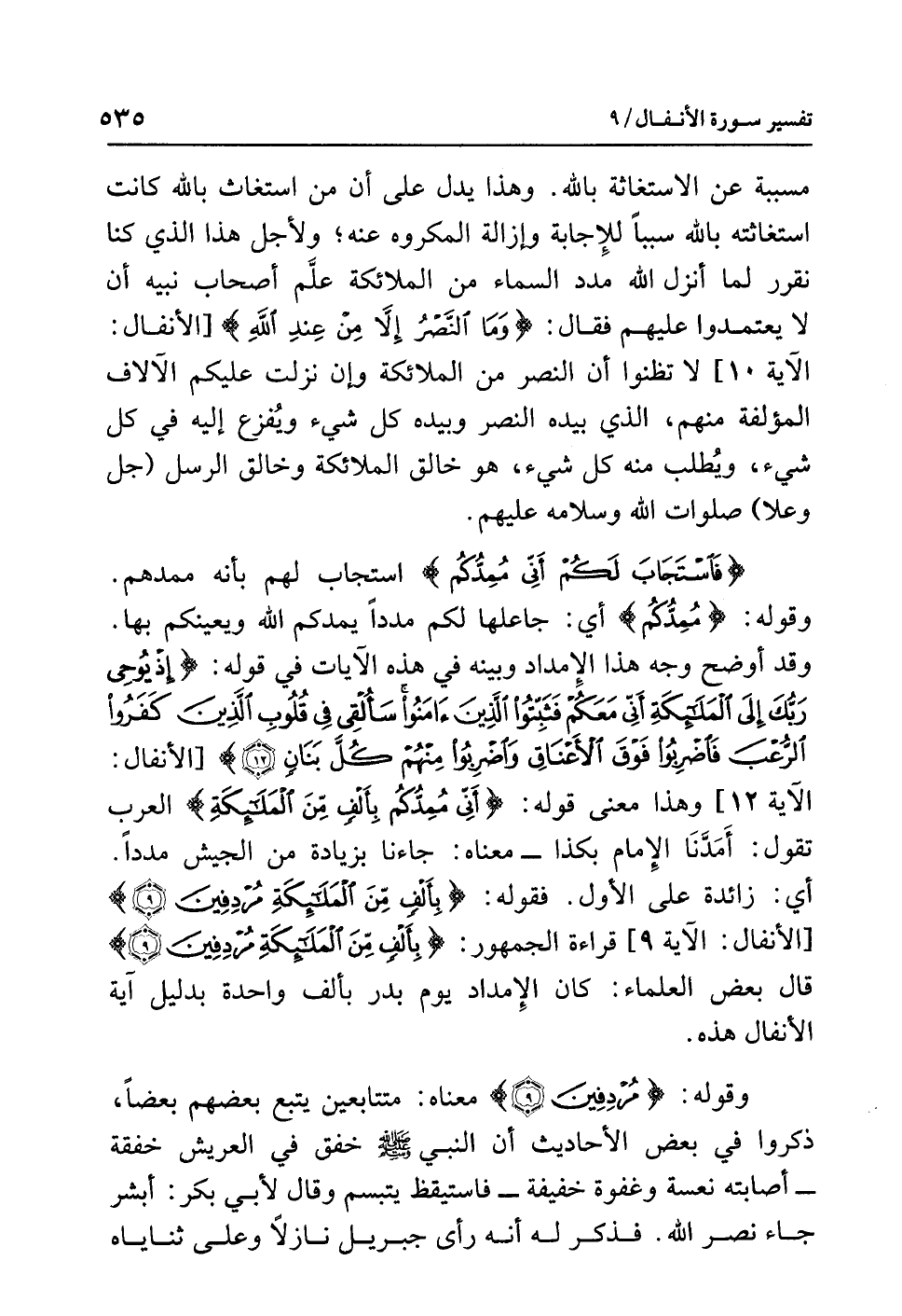 {فَاسْتَجَابَ لَكُمْ أَنِّي مُمِدُّكُم} استجاب لهم بأنه ممدهم. وقوله: {مُمِدُّكُم} أي: جاعلها لكم مددًا يمدكم الله ويعينكم بها. وقد أوضح وجه هذا الإمداد وبينه في هذه الآيات في قوله: {إِذْ يُوحِي رَبُّكَ إِلَى الْمَلآئِكَةِ أَنِّي مَعَكُمْ فَثَبِّتُواْ الَّذِينَ آمَنُواْ سَأُلْقِي فِي قُلُوبِ الَّذِينَ كَفَرُواْ الرُّعْبَ فَاضْرِبُواْ فَوْقَ الأَعْنَاقِ وَاضْرِبُواْ مِنْهُمْ كُلَّ بَنَانٍ (12)} [الأنفال: الآية 12] وهذا معنى قوله: {أَنِّي مُمِدُّكُم بِأَلْفٍ مِّنَ الْمَلآئِكَةِ} العرب تقول: أَمَدَّنَا الإمام بكذا، معناه: جاءنا بزيادة من الجيش مددًا؛ أي: زائدة على الأول، فقوله: {بِأَلْفٍ مِّنَ الْمَلآئِكَةِ مُرْدِفِينَ} [الأنفال: الآية 9] قراءة الجمهور: {بِأَلْفٍ مِّنَ الْمَلآئِكَةِ مُرْدِفِينَ} قال بعض العلماء: كان الإمداد يوم بدر بألف واحدة بدليل آية الأنفال هذه.
